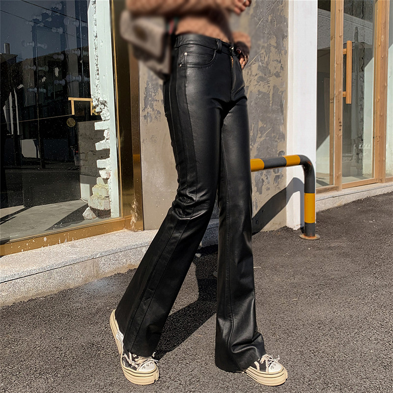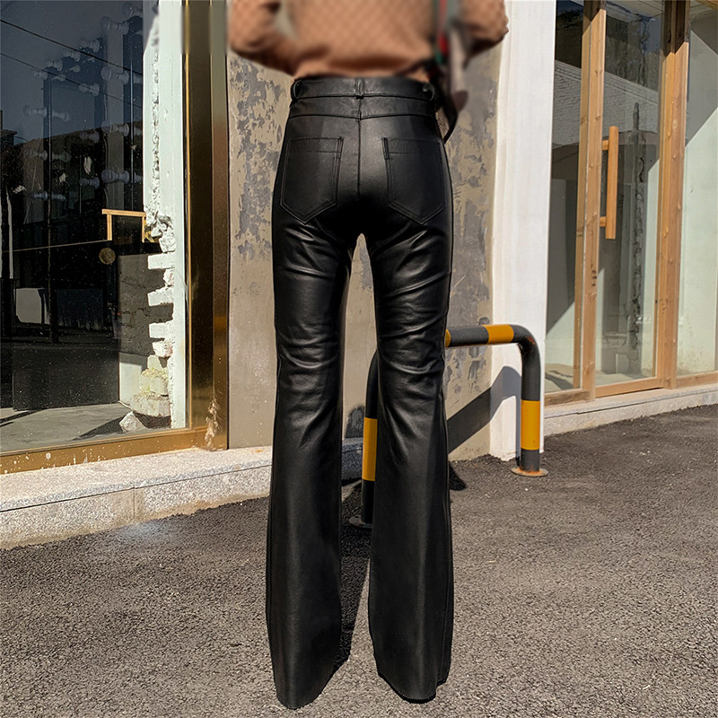 Leather flared pants Women's fashion versatile mid-rise casual pants Slim-fit thin pure cowhide micro flared pants wear trousers