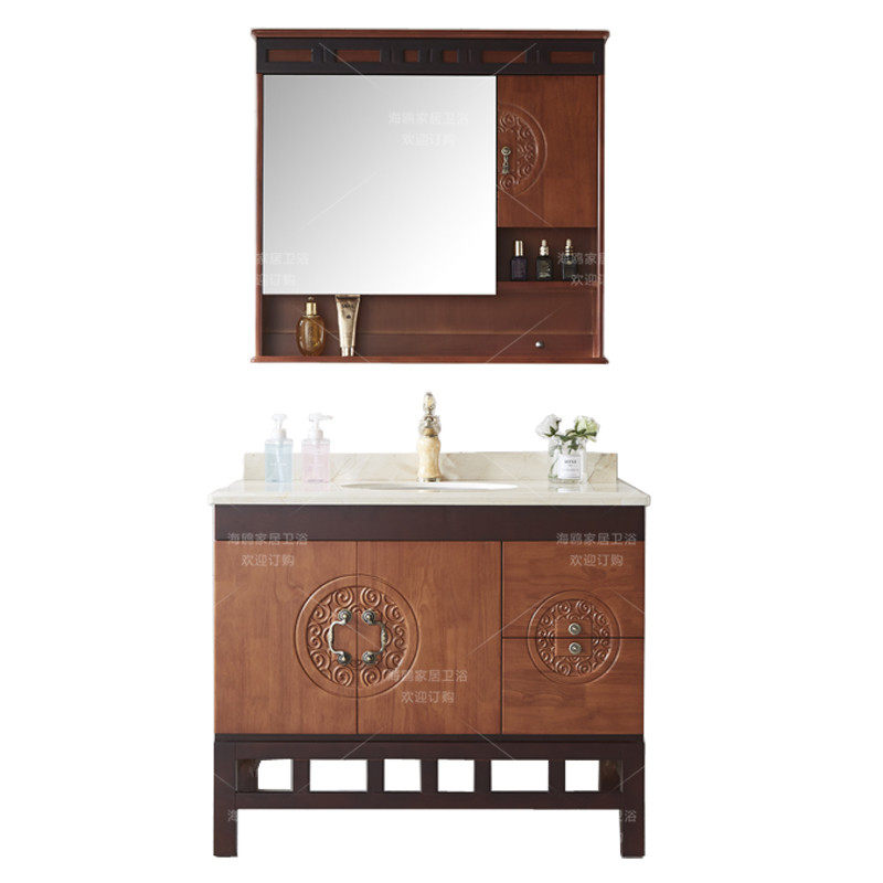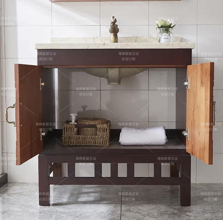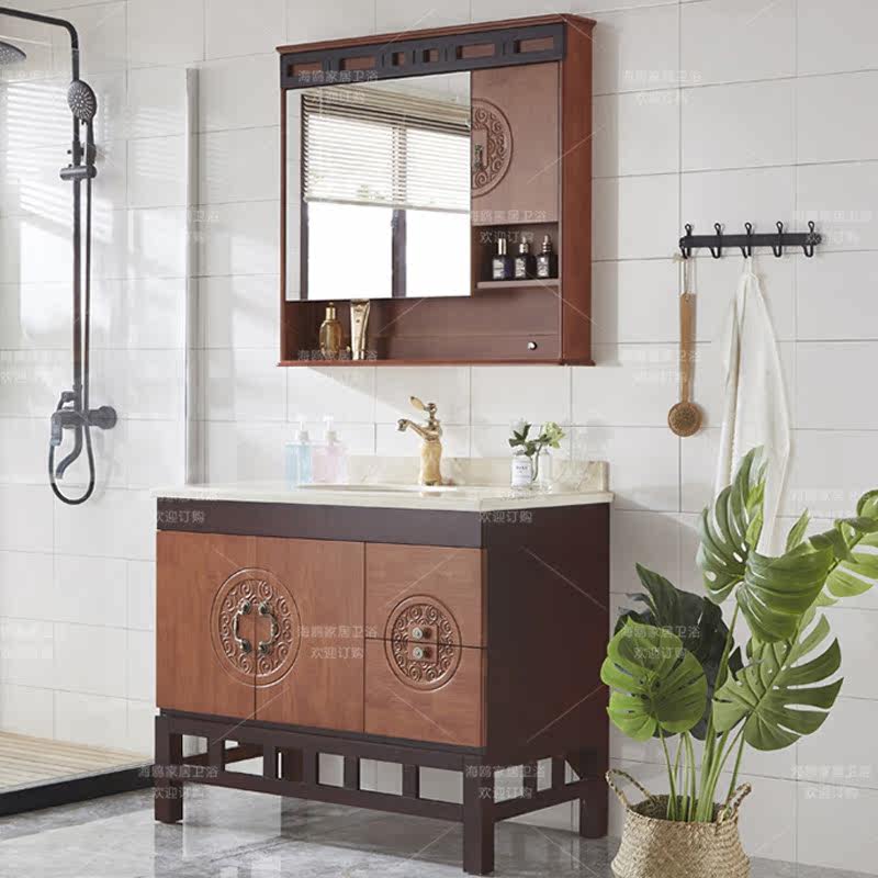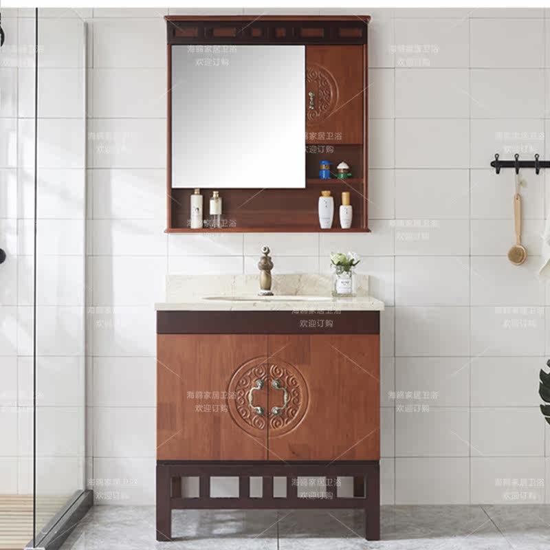 Oak Wood Bathroom Cabinet Ground New Chinese Bath Room Cabinet China Wind Marble Wash Pool Mix Hitch Color Storage Mirror Cabinet-Taobao