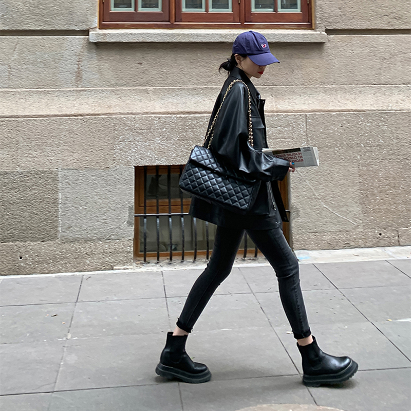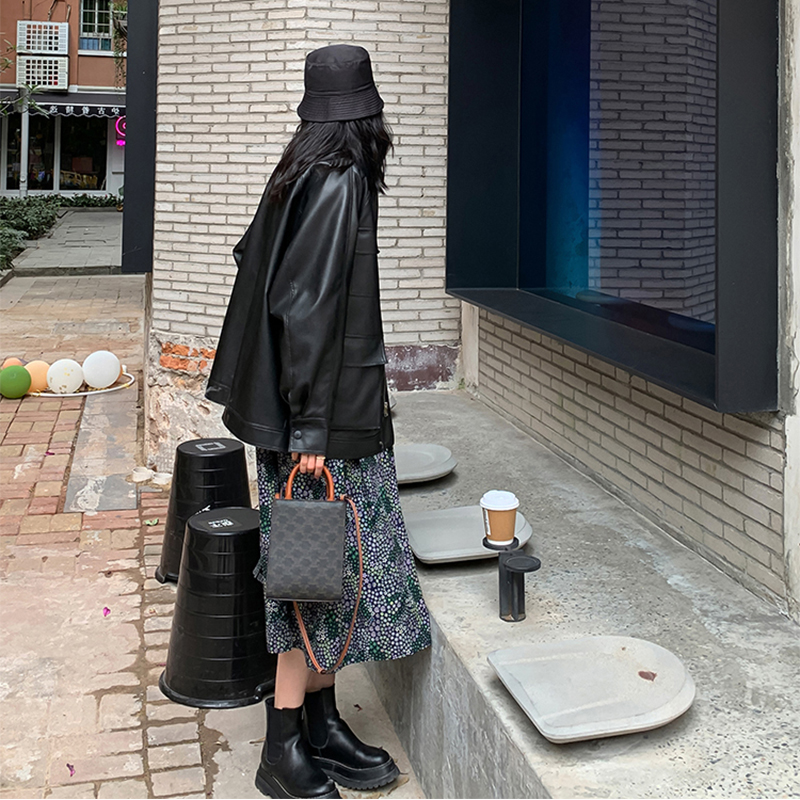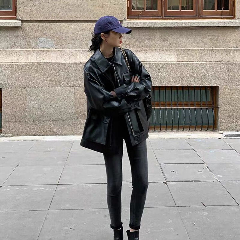 Sheep leather jacket women's motorcycle clothing long version spring and autumn new retro loose black leather jacket plus cotton