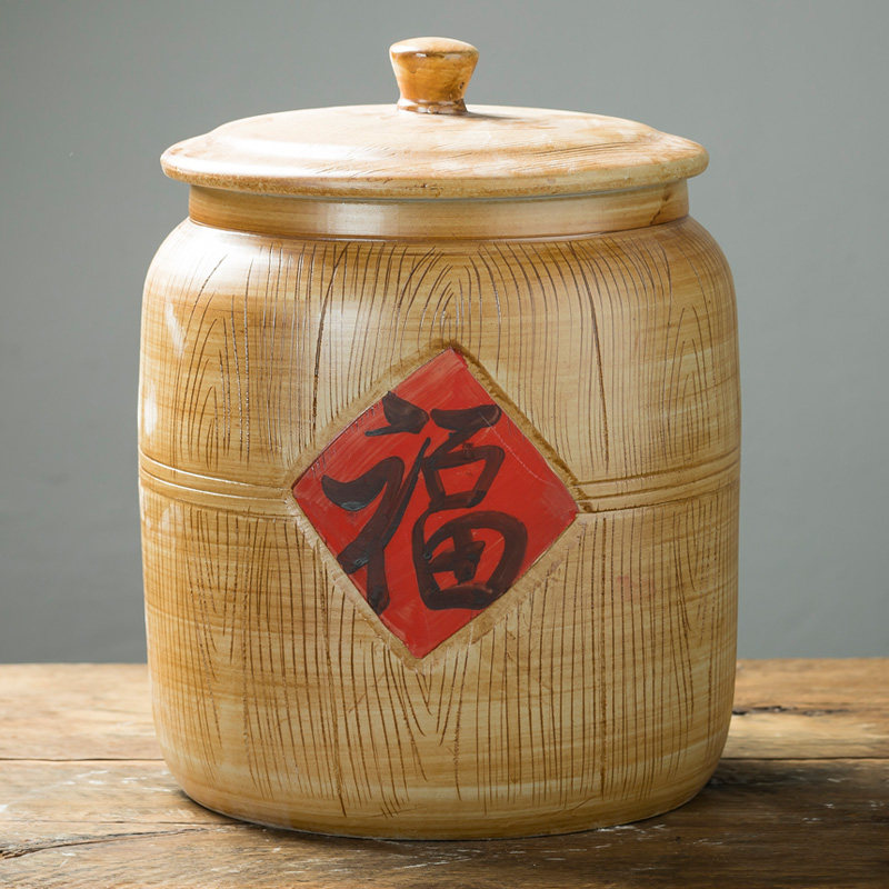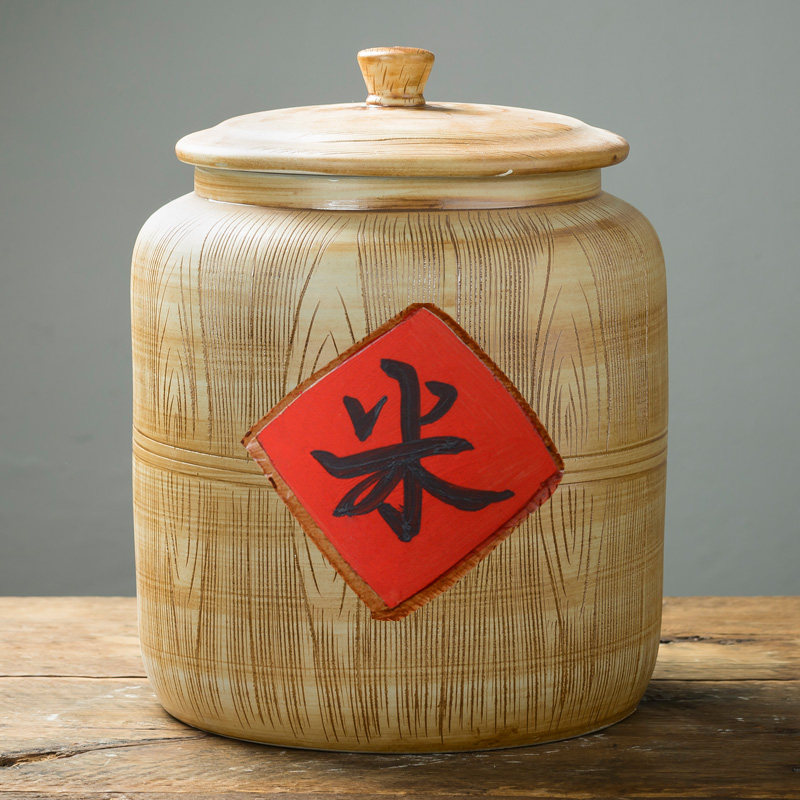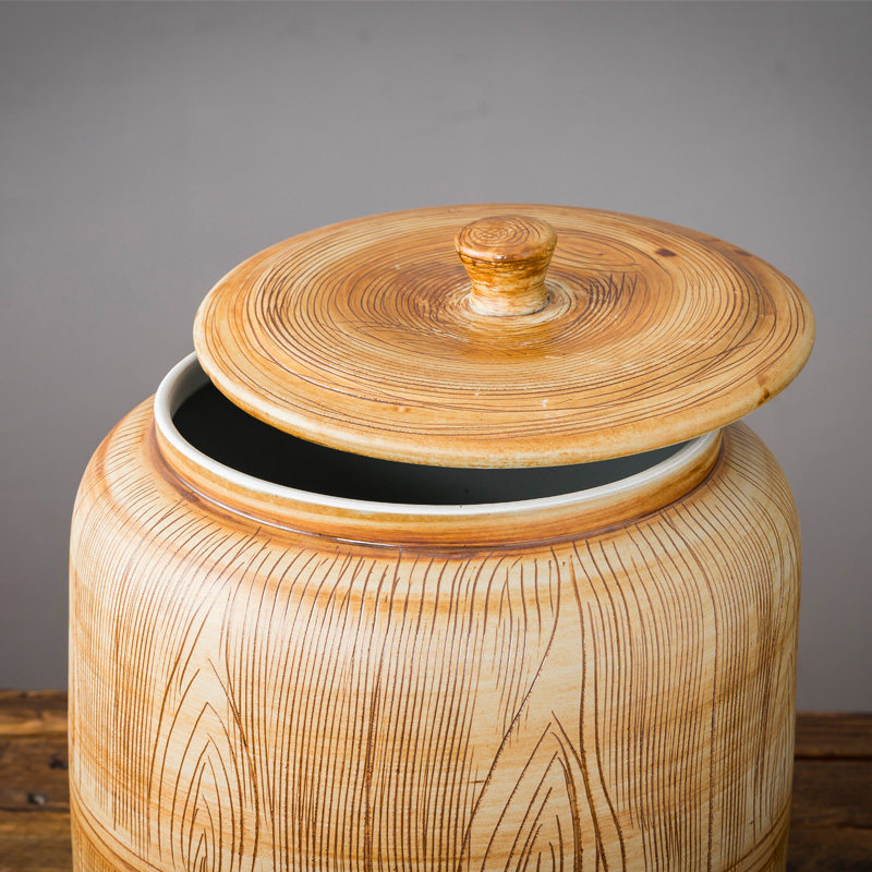 Jingdezhen engraving wood grain winter melon ceramic rice cylinder with cover domestic rice barrel sealing tank flour barrel anti-insect storage rice pot-Taobao