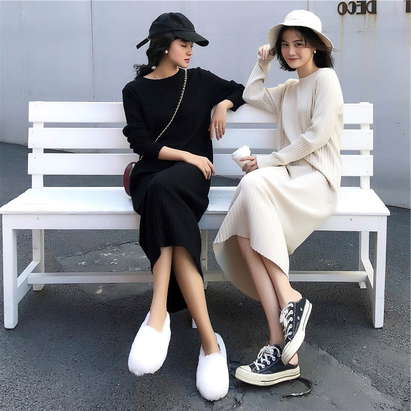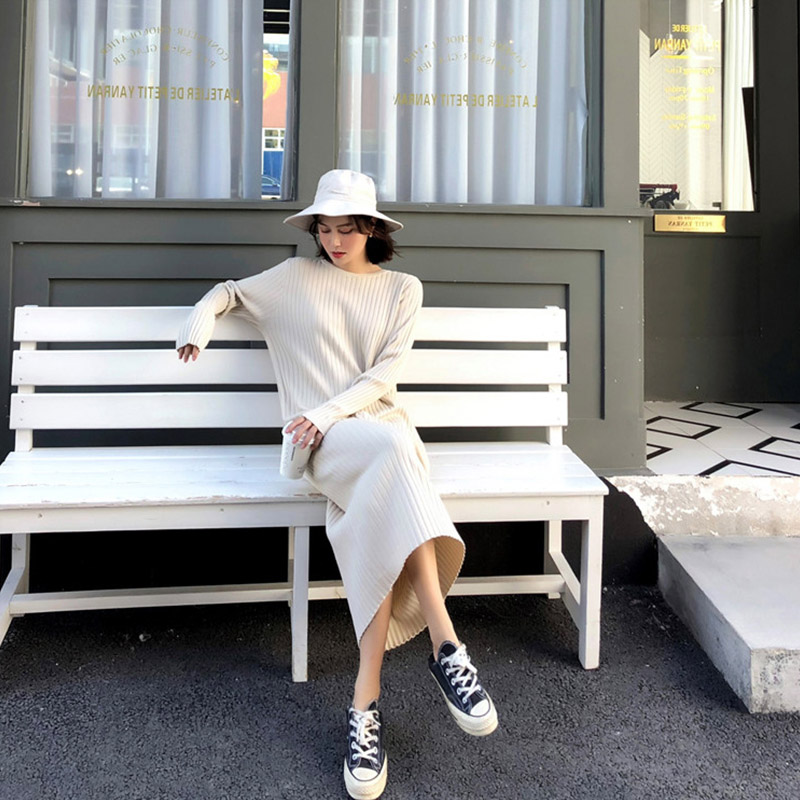Long skirt with coat, bottom sweater skirt, knee loose Korean version of long knitted dress autumn and winter women's temperament