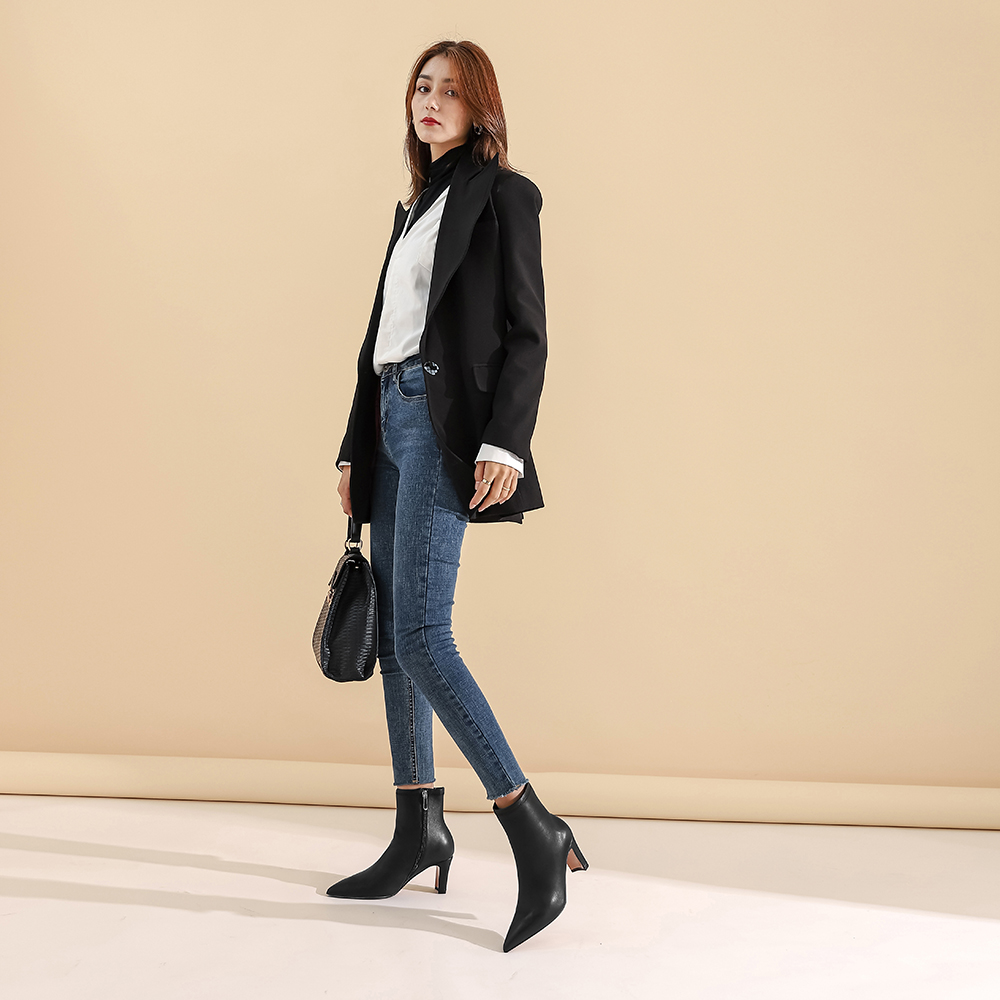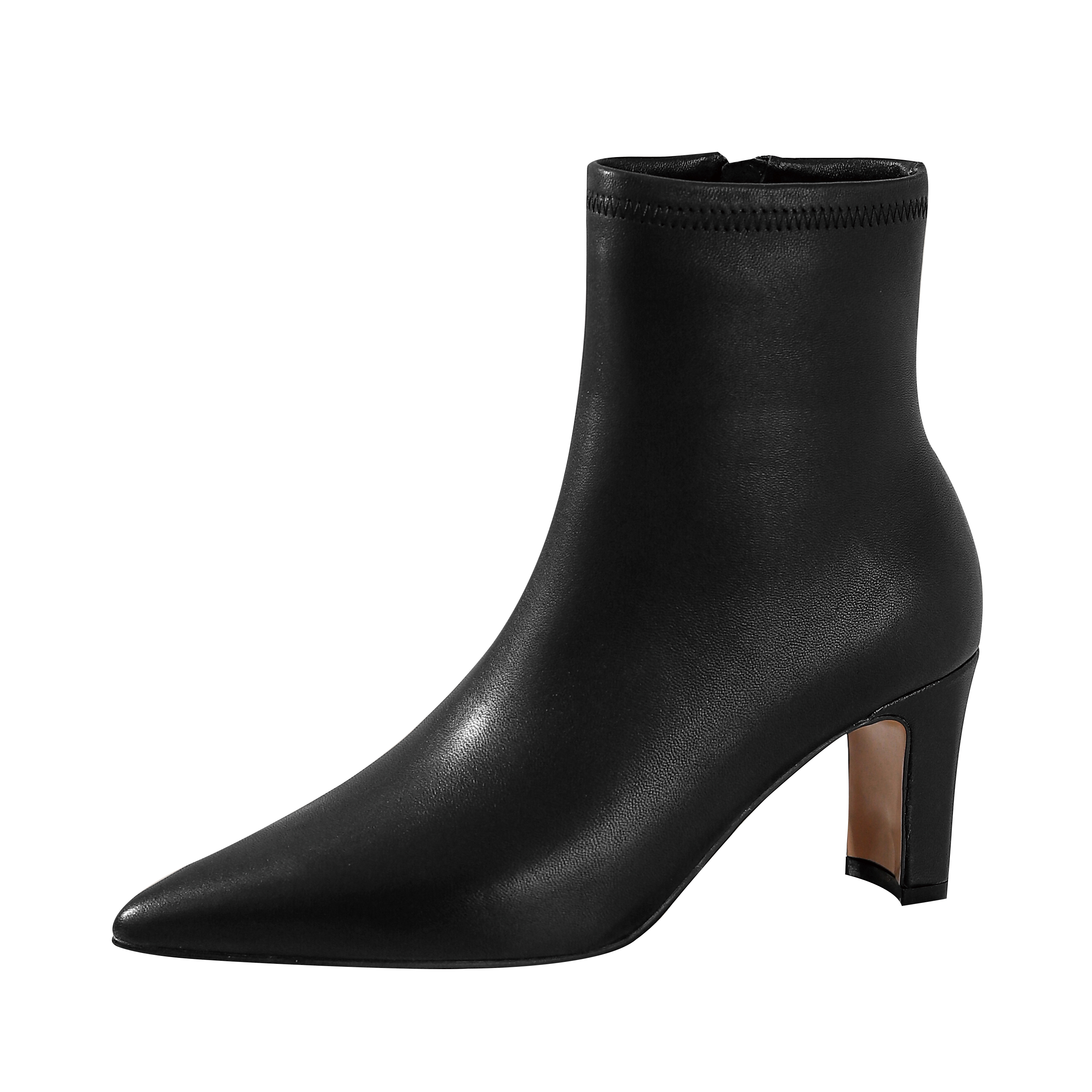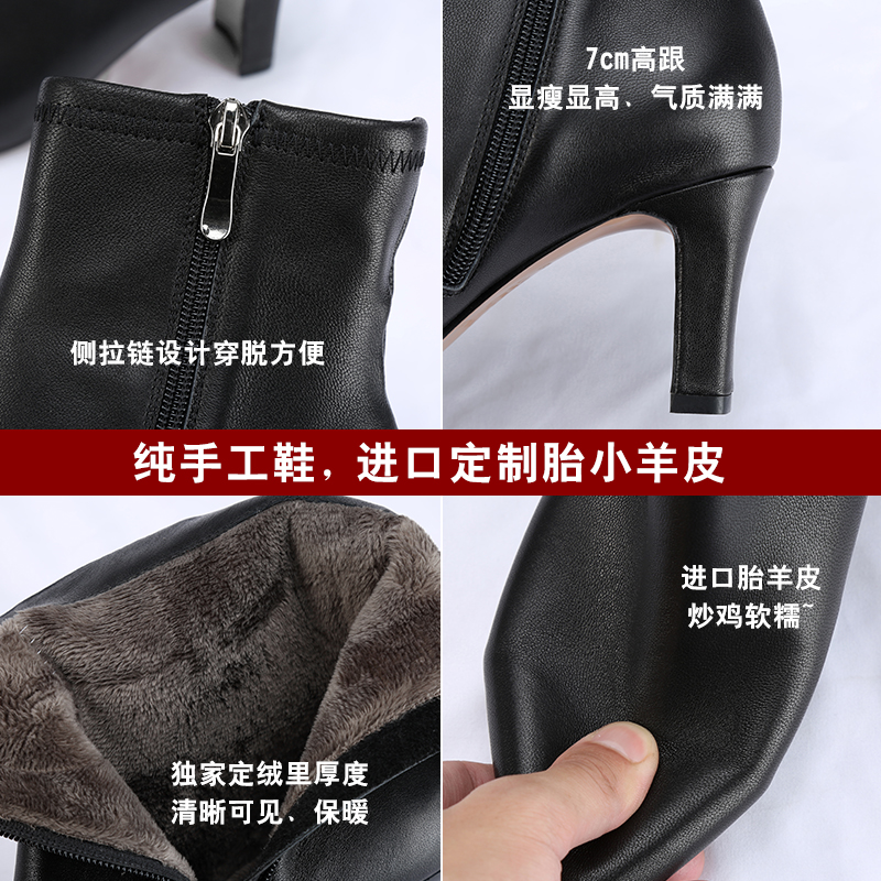 Women's sheepskin short boots 2022 autumn and winter thick heel retro single boot pointed toe work high heel nude boots plus velvet real soft leather boots