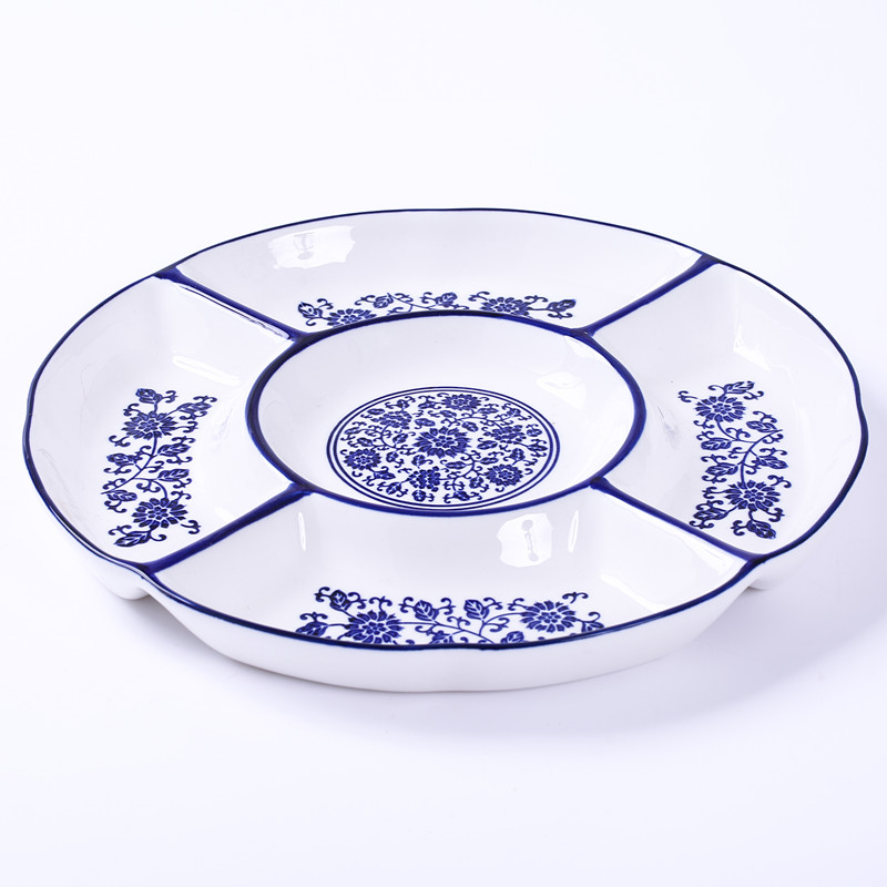 Pure white 8-inch five-fruit plate (small) pure white 10-inch five-fruit plate pure white 12-inch five-fruit plate blue and white 10-inch five-fruit plate blue and white 12-inch five-fruit plate