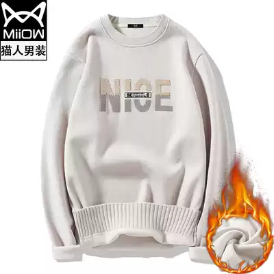 Cat Man 2021 Winter wear new men's round neck sweater plus velvet casual solid color bottoming sweater men