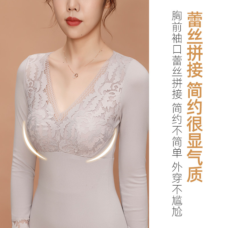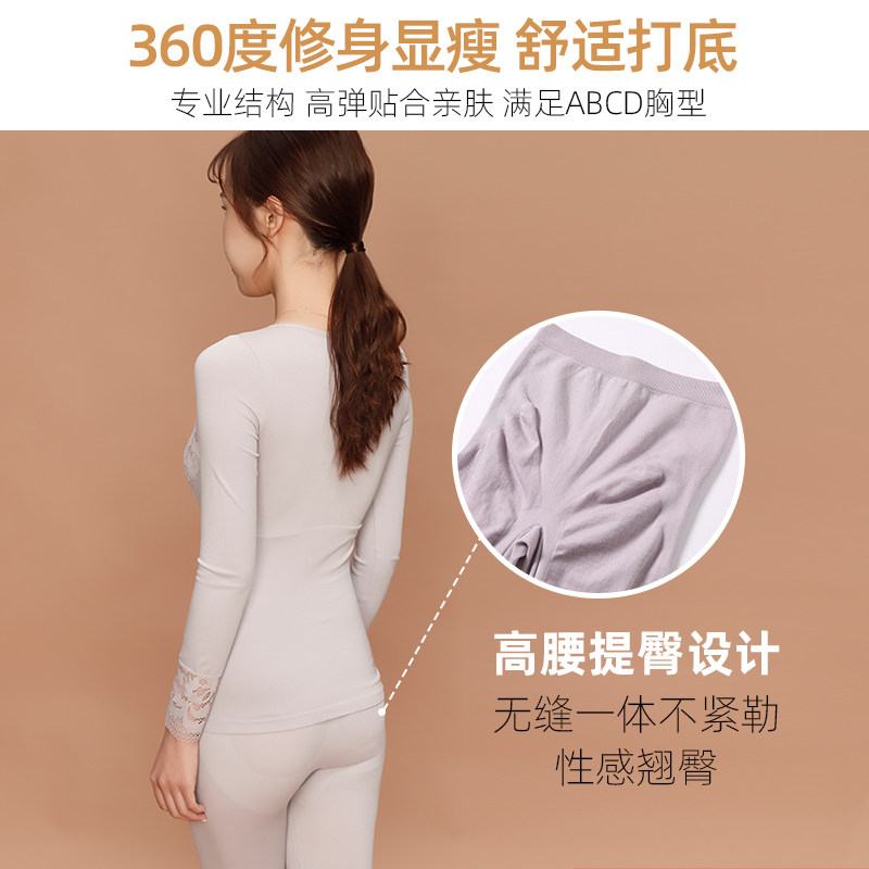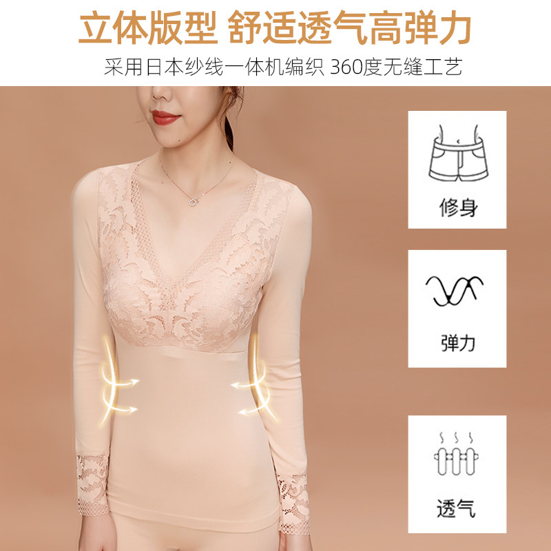 Autumn and winter long-sleeved lace bottoming shirt women's mesh inner hollow body sculpting with chest pad heating pants women