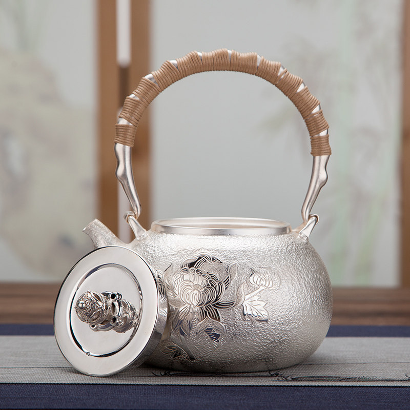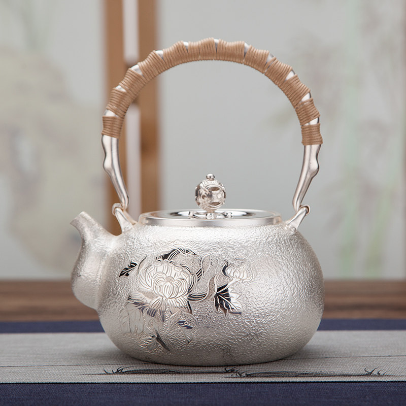 Pure hand silver kettle large capacity silver teapot household with a pure silver 999 kettle rich peony silver kettle