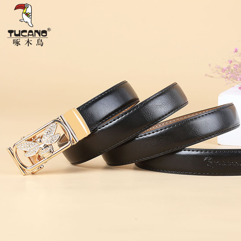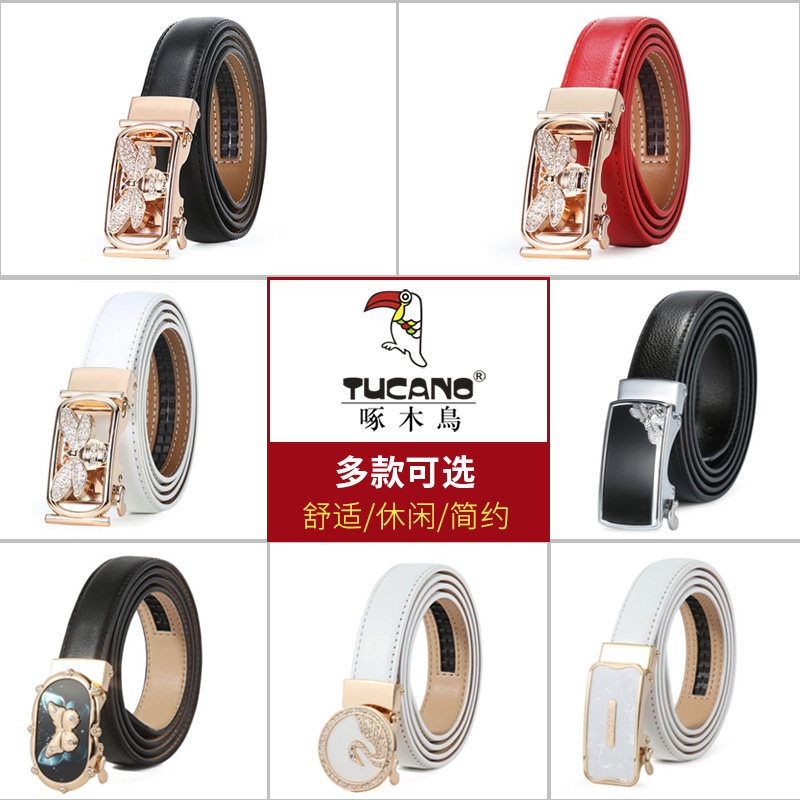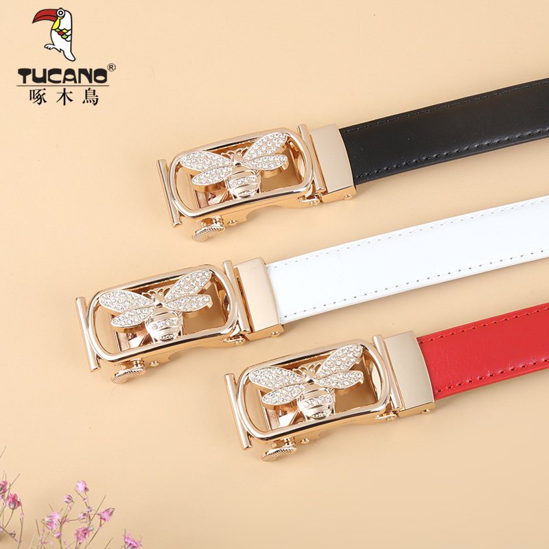 Woodpecker belt Women's wild fashion leather automatic buckle belt Women's summer decorative waist ins jeans belt thin
