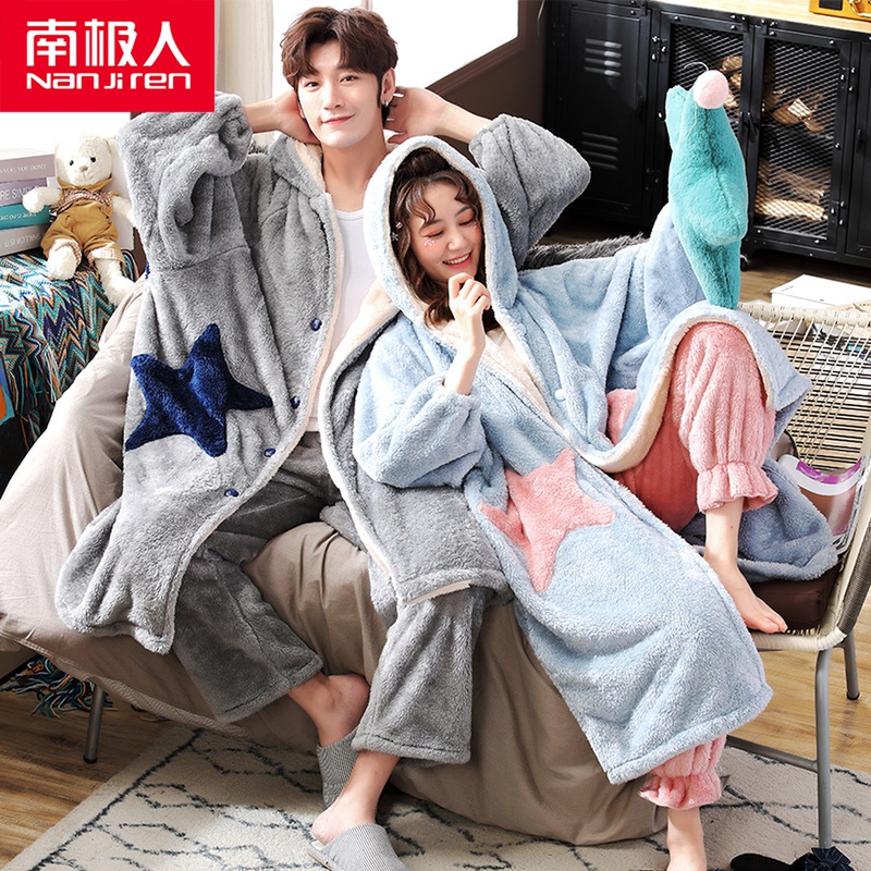 Coral flannel pajamas Men and women couples hooded autumn and winter stars long version nightgown dress Home clothes wear suit