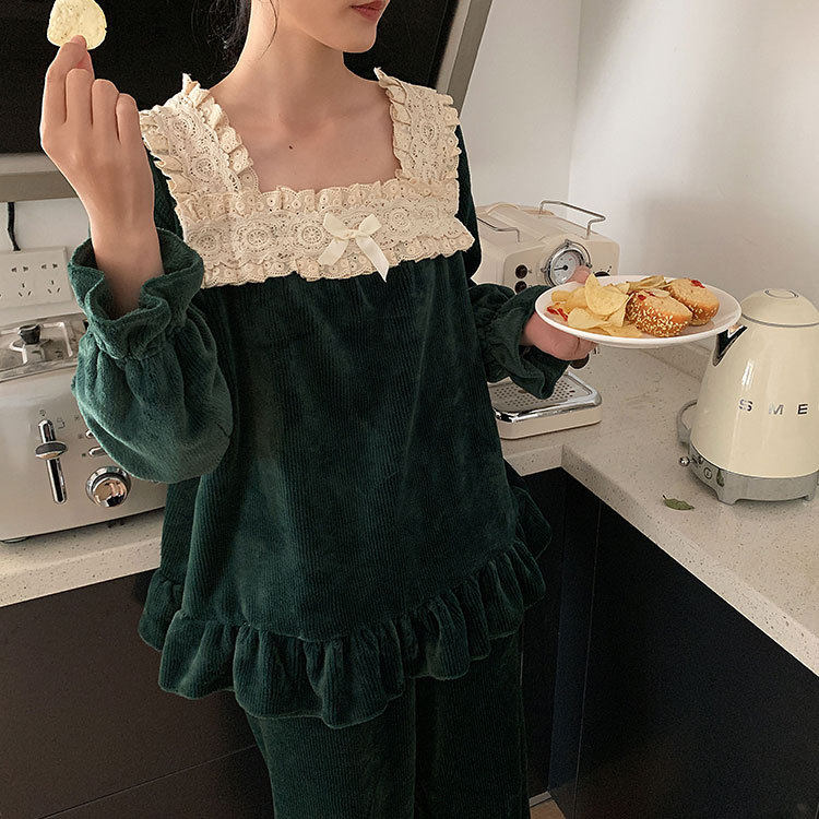 Autumn Winter Thickened Flannel Princess Wind Sweet Beauty Cute Coral Suede Home Suit Long Sleeve Warm Pyjamas Woman