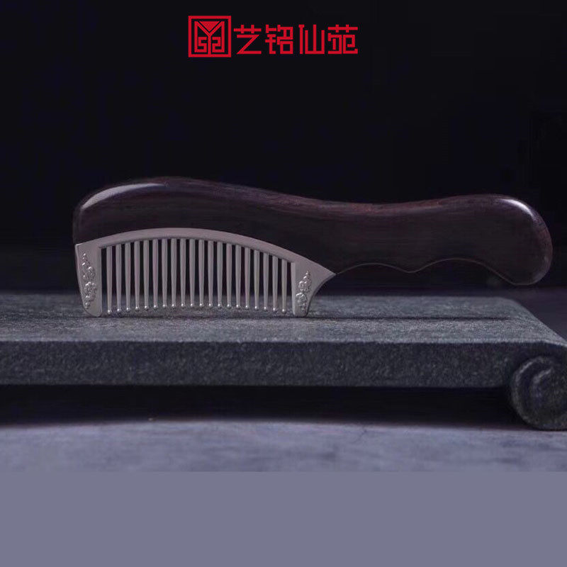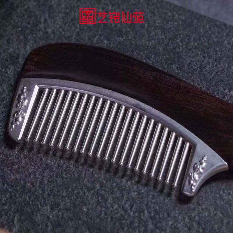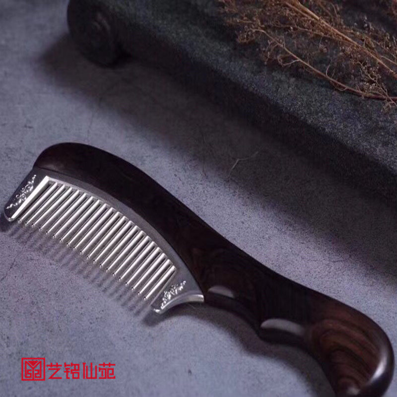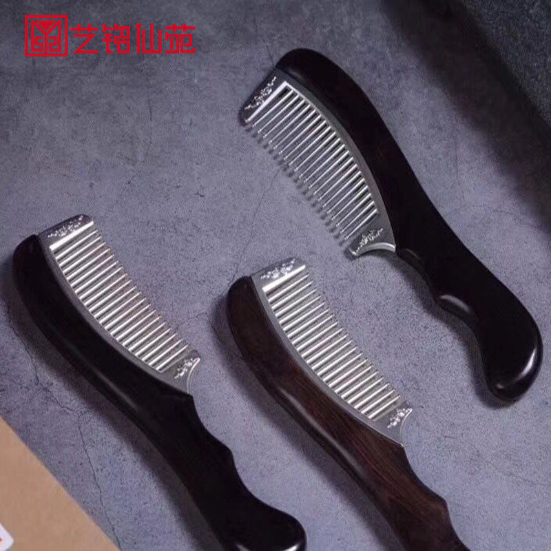 Purple sandalwood inlaid silver comb Black sandalwood solid wood silver plated long handle comb to send girlfriend to send mother gift gift