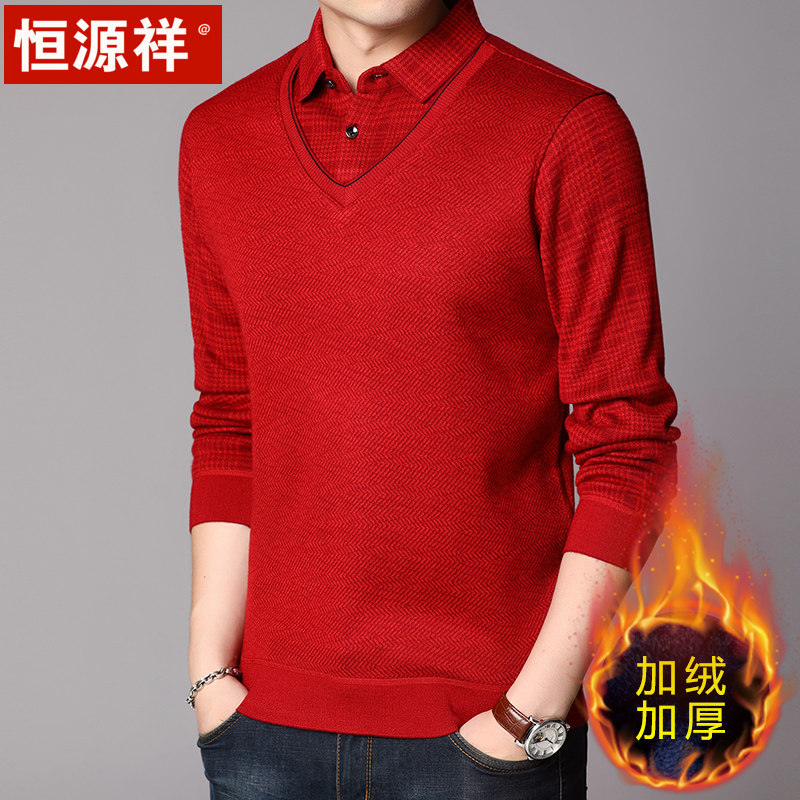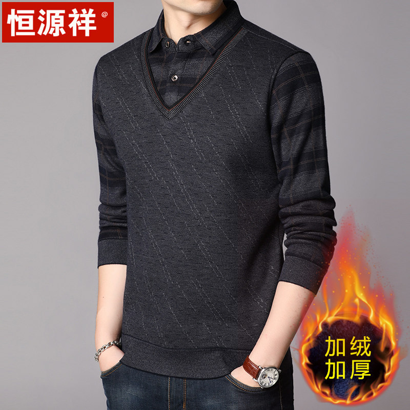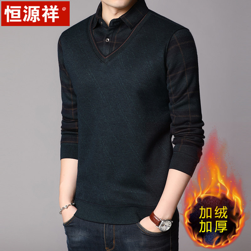 Hengyuan Xiang Fake two warm shirts collar male garnter thickened sweater winter middle-aged long sleeve blouse warm lining clothes-Taobao