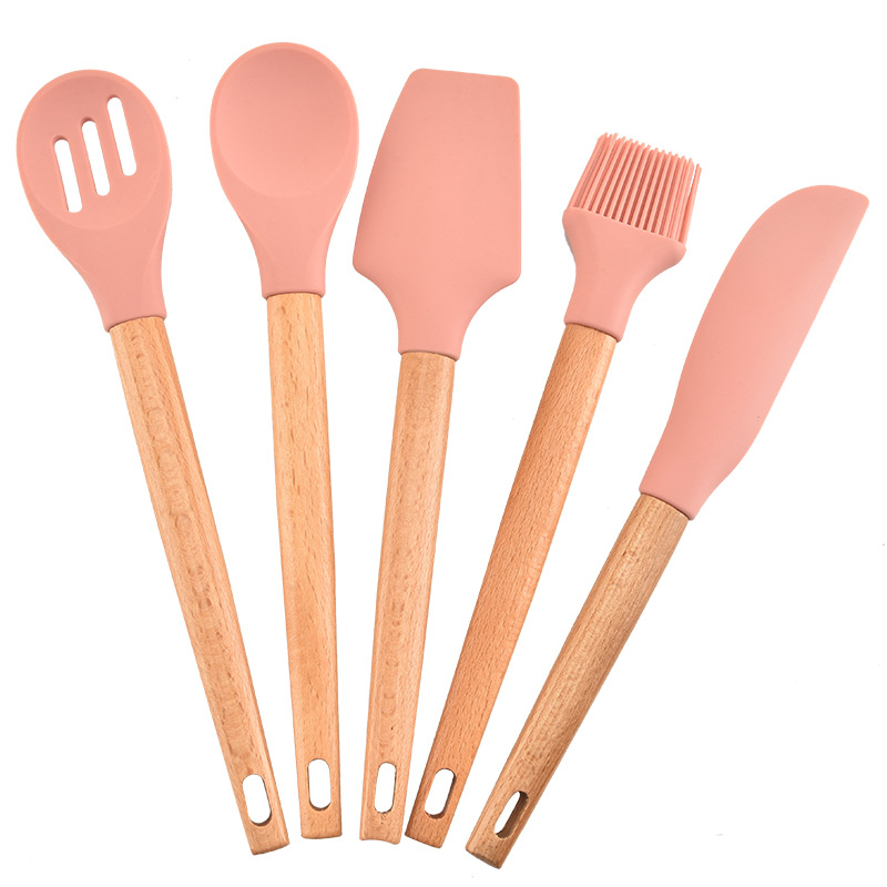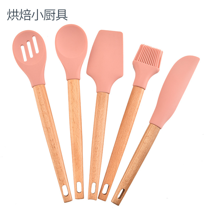 Kitchen high temperature beech handle silicone kitchenware food grade non-stick pan Five-piece dense spoon colander Oil brush scraper