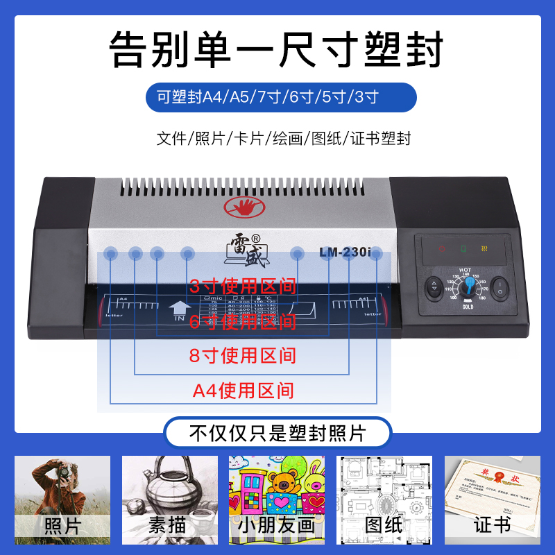 Over plastic machine Leisheng LM-230i photo sealing machine office commercial home a4 rubber machine cold mounting hot mounting dual-use plastic machine photo recipe file temporary ID card mobile phone case laminating machine
