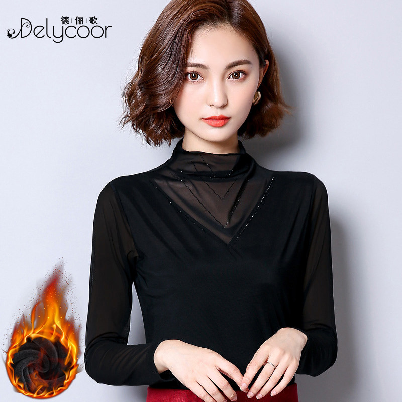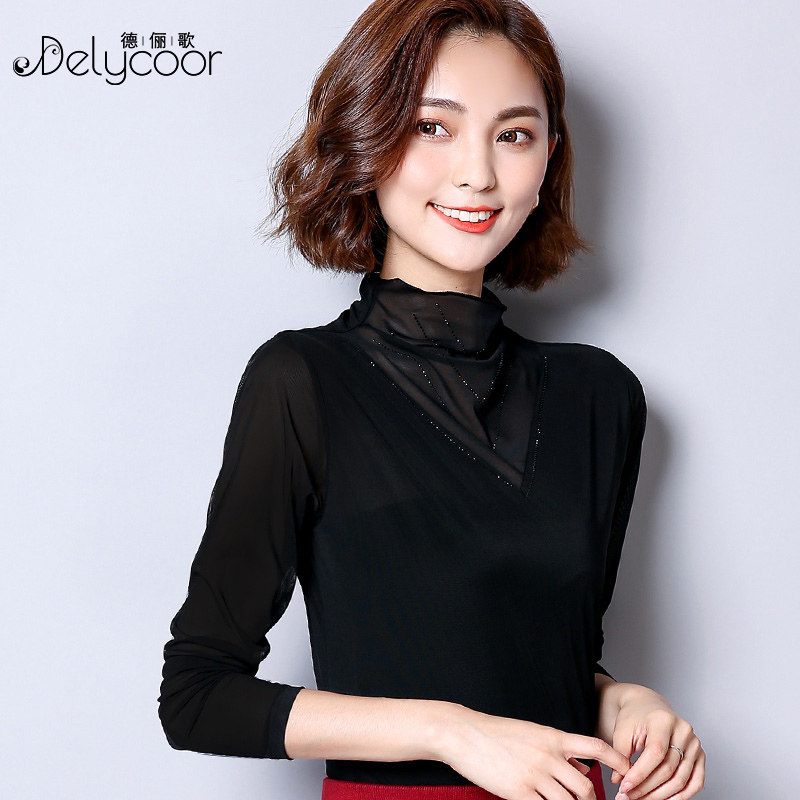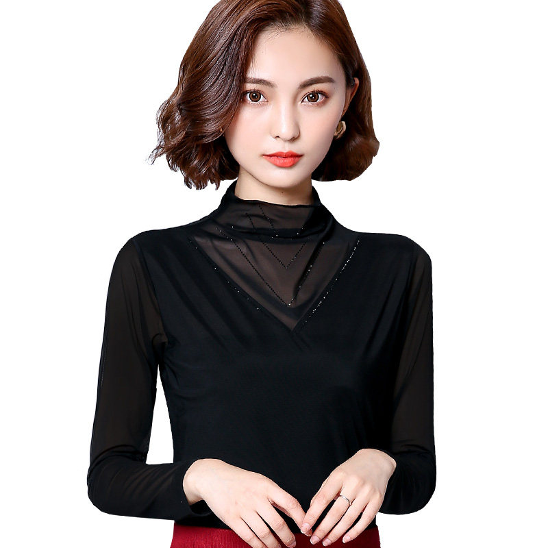 Lace base shirt women's spring and Autumn thin Western style black turtleneck mesh top Small shirt Wild long-sleeved T-shirt