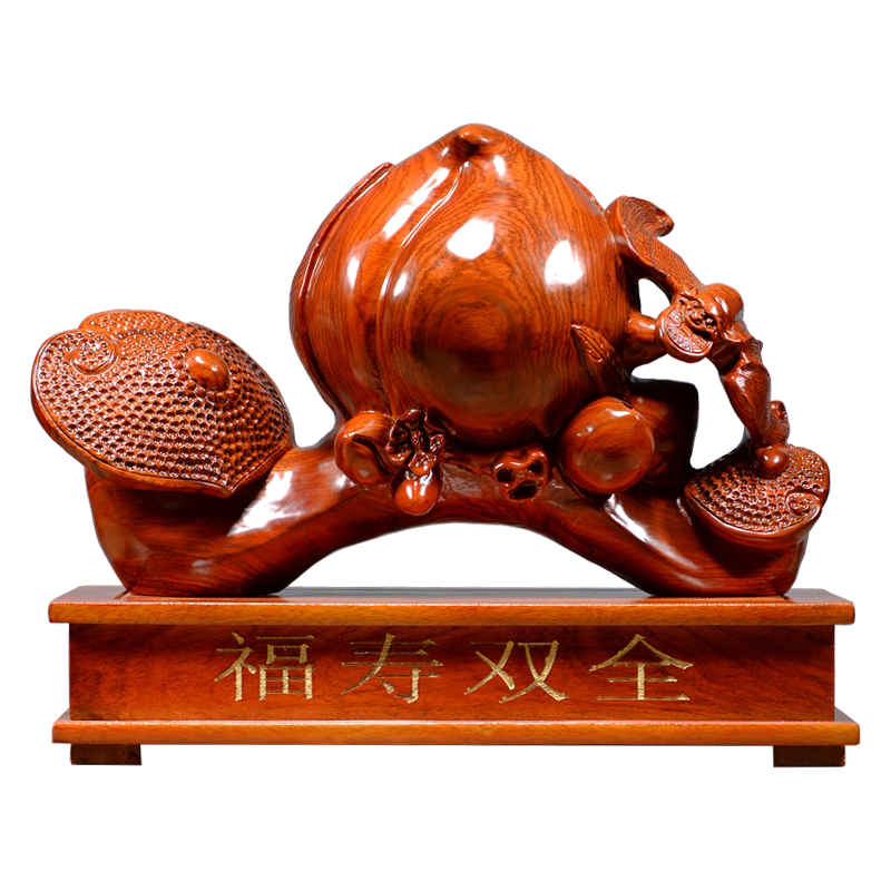 Cub square pear wood carving Fushou double peach wishful decoration Solid wood living room home decoration Birthday birthday gift