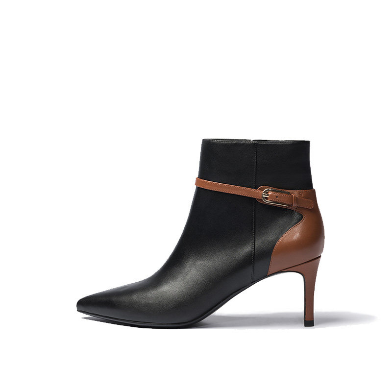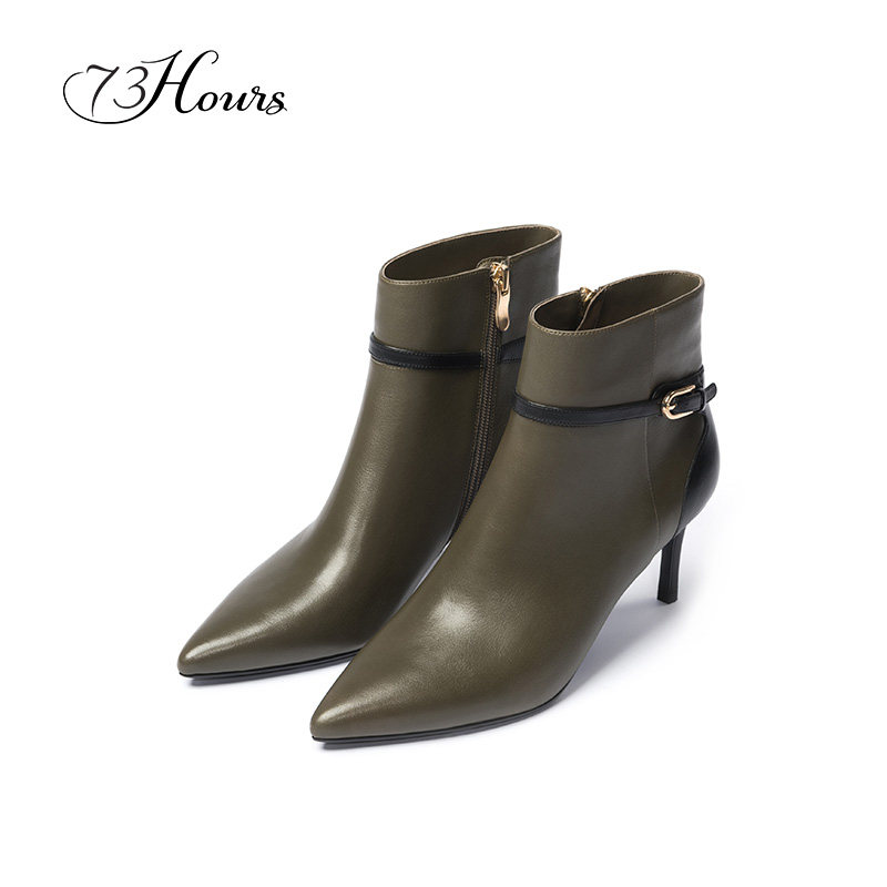 73Hours women's shoes Side B new short boots pointed toe stitching leather high heels simple buckle British fashion boots