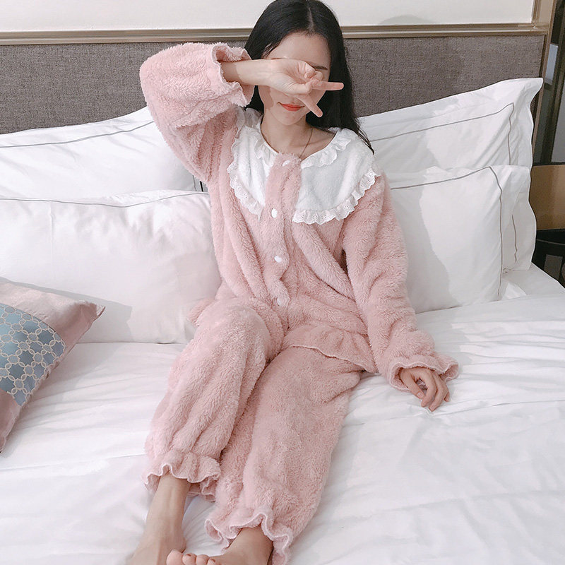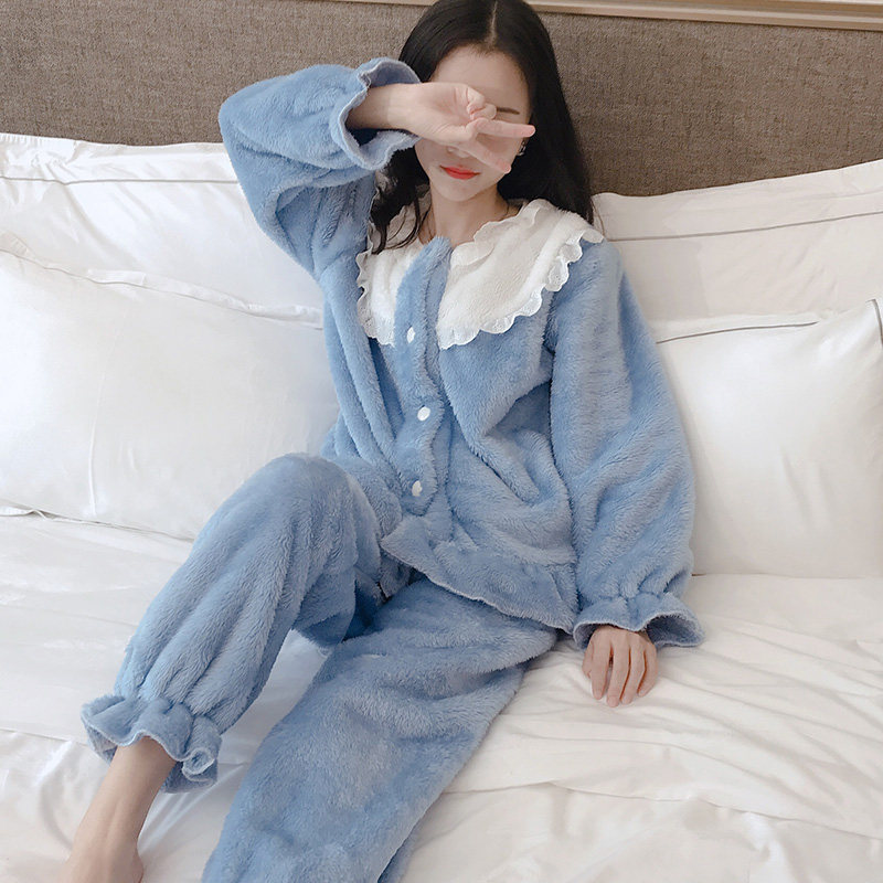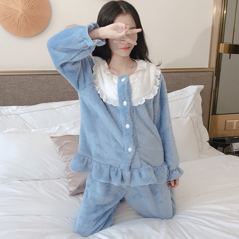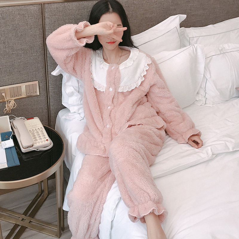 Cardigan princess pajamas women's autumn and winter thickened lace coral fleece student warm flannel homewear suit