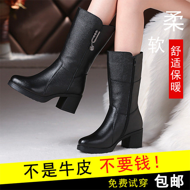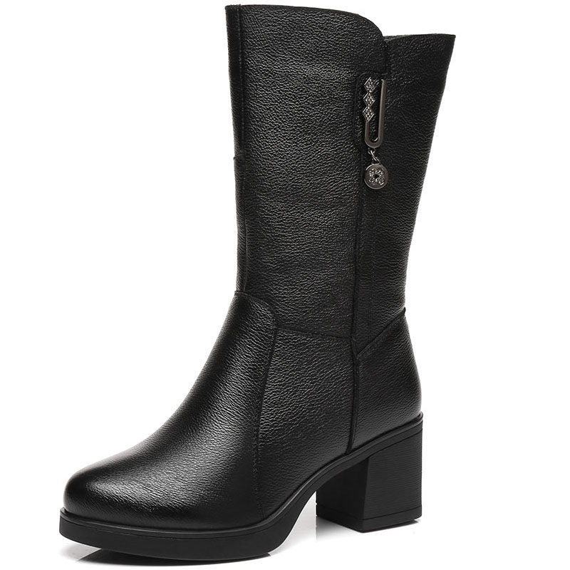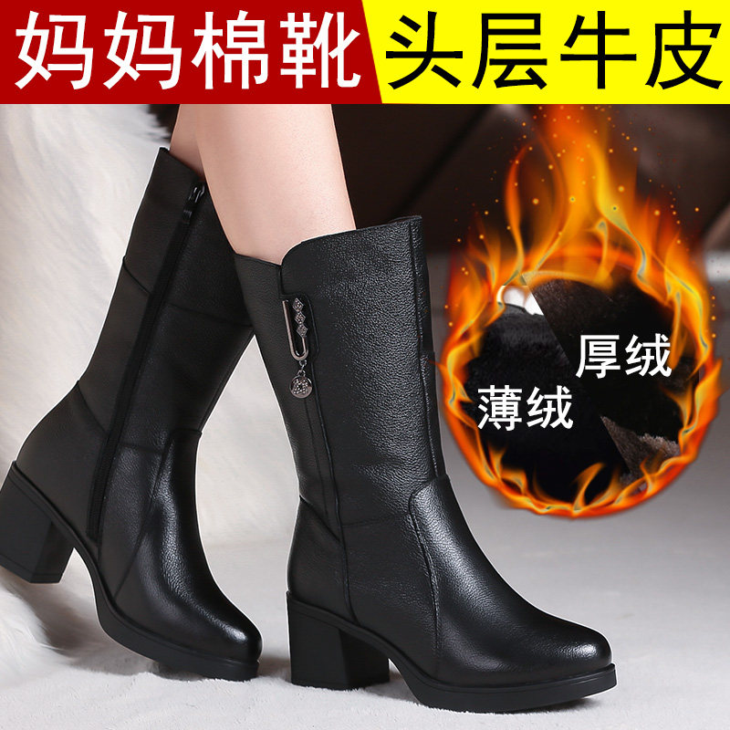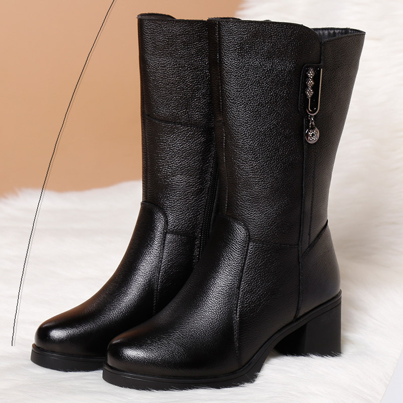 Boots women's 2022 autumn and winter leather mid-well boots plus velvet soft-soled mother shoes long leather boots thick heel mid-heel women's boots