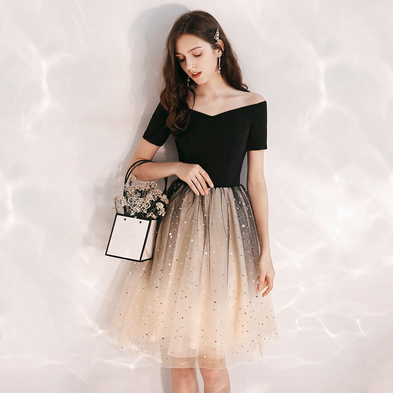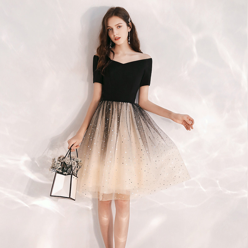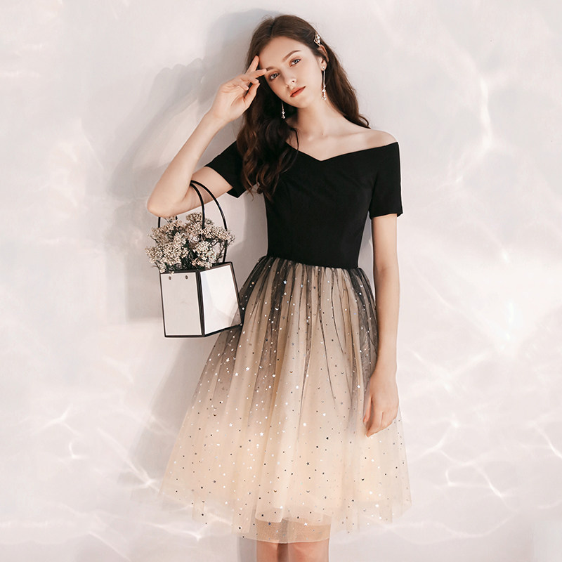 Black French small dinner dress female banquet shoulder shoulder to shoulder sky clothing short temperament can usually wear
