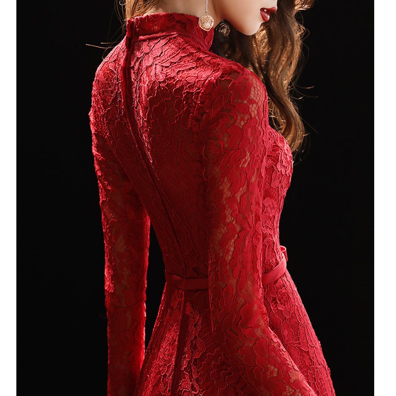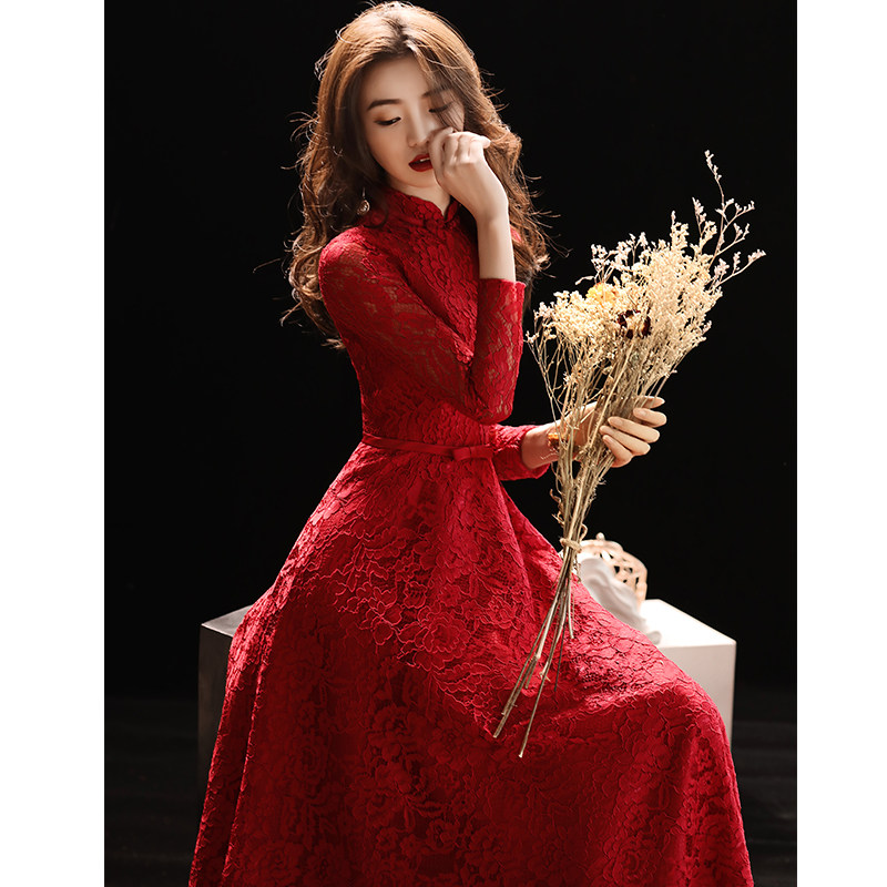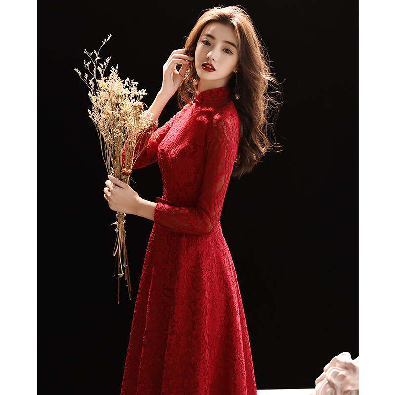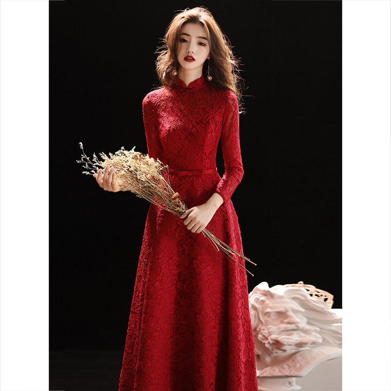 Toast clothing bride wine red 2023 new long wedding dress engagement dress stand collar lace long sleeve women