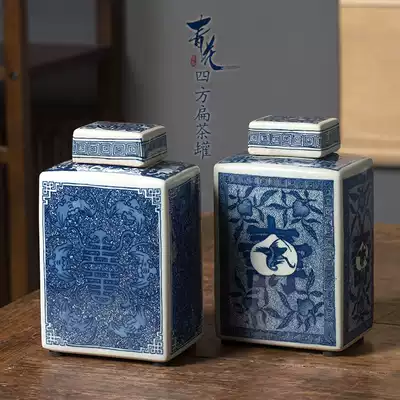 Blue and White Crane Shou peach pattern flat tea pot antique blue and white basket land Fushou bat pattern square pot 400g tea