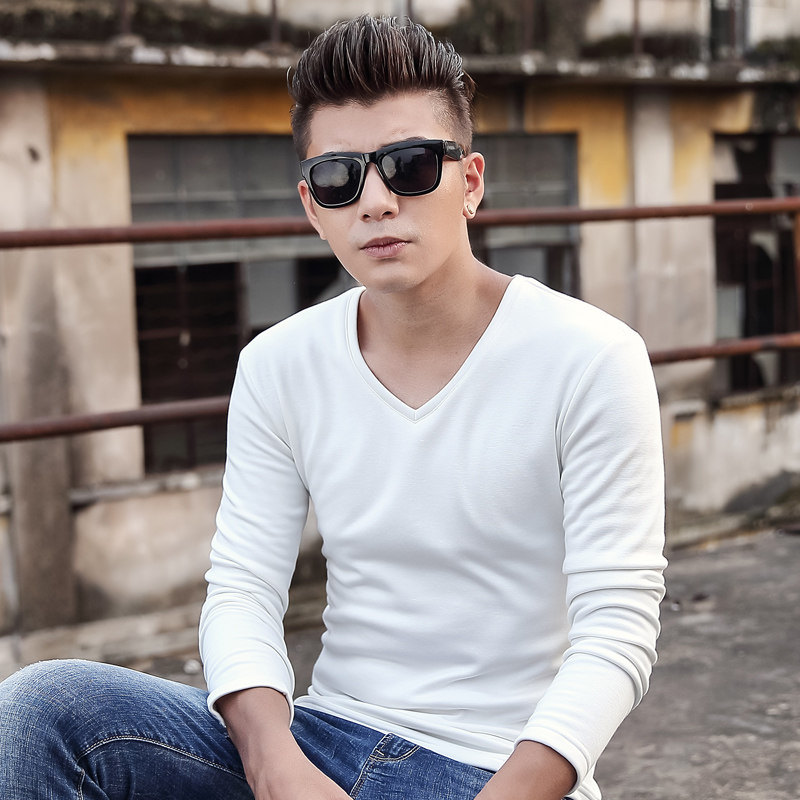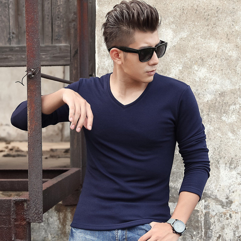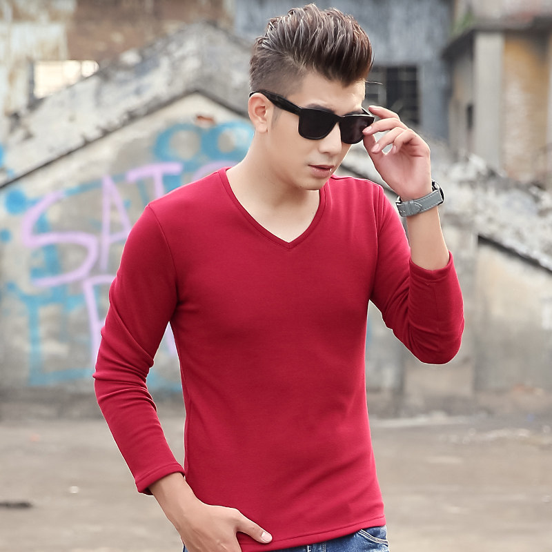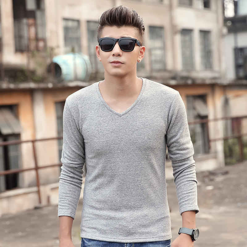 Jiacheng bird plus velvet bottoming shirt autumn and winter V-neck men's wear with slim men's long-sleeved T-shirt thickened warm solid color
