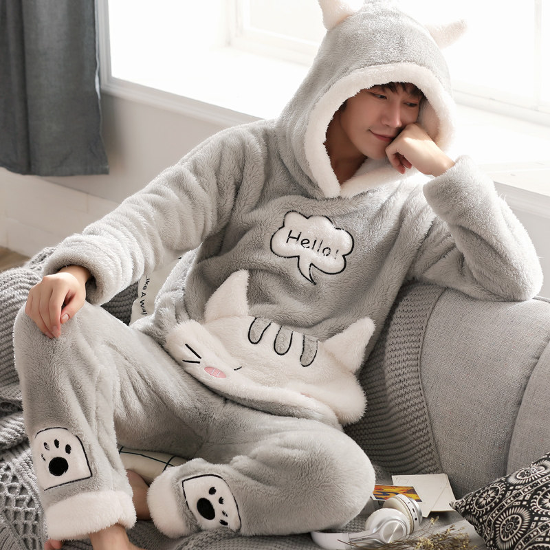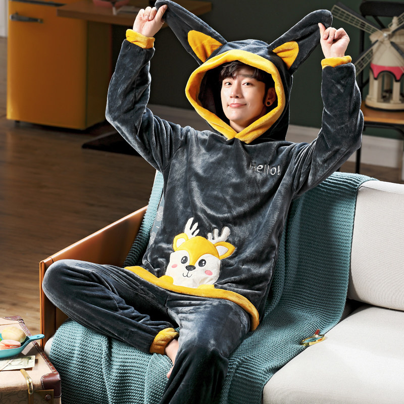Men's pajamas fall winter coral velvet thickening plus flannel cartoon student home suit winter suit