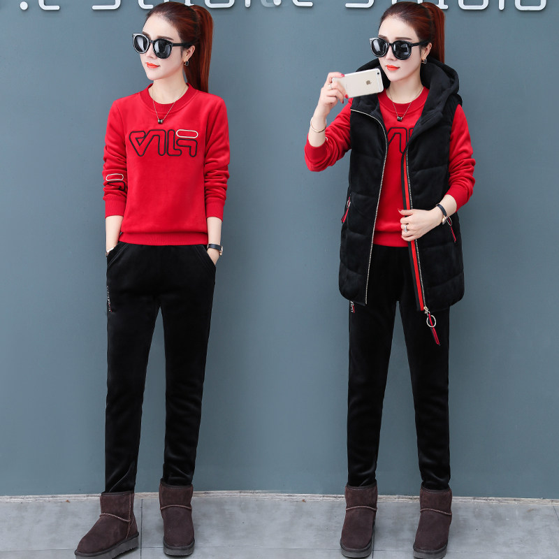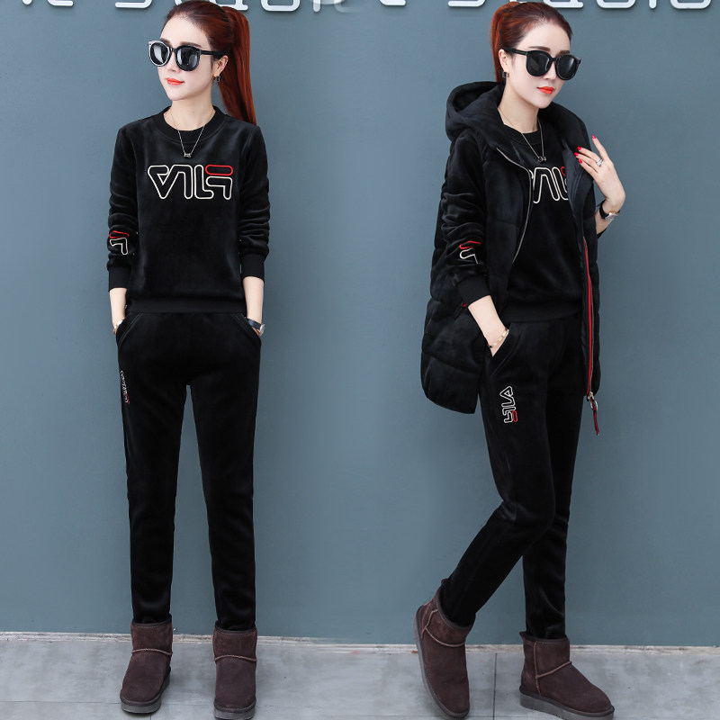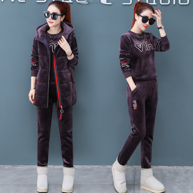 Gold Velvet Suit Women's Winter Clothing Three Sets 2021 New Fashion Temperament Warm Vest Loose Thickened Thick Cotton T