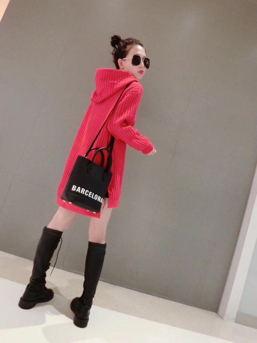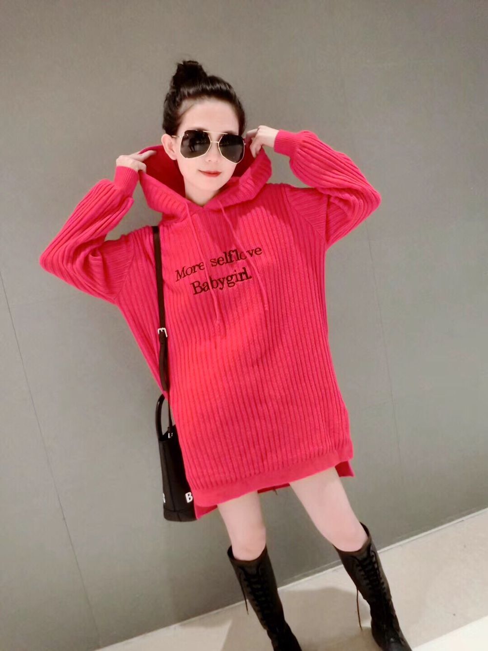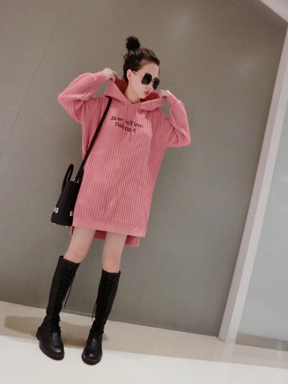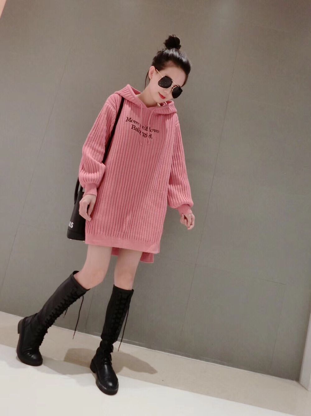 Middle - long - range dress female loose Han edition 2023 Spring and Autumn new knitted long - sleeved head pink - hood dress