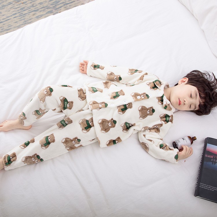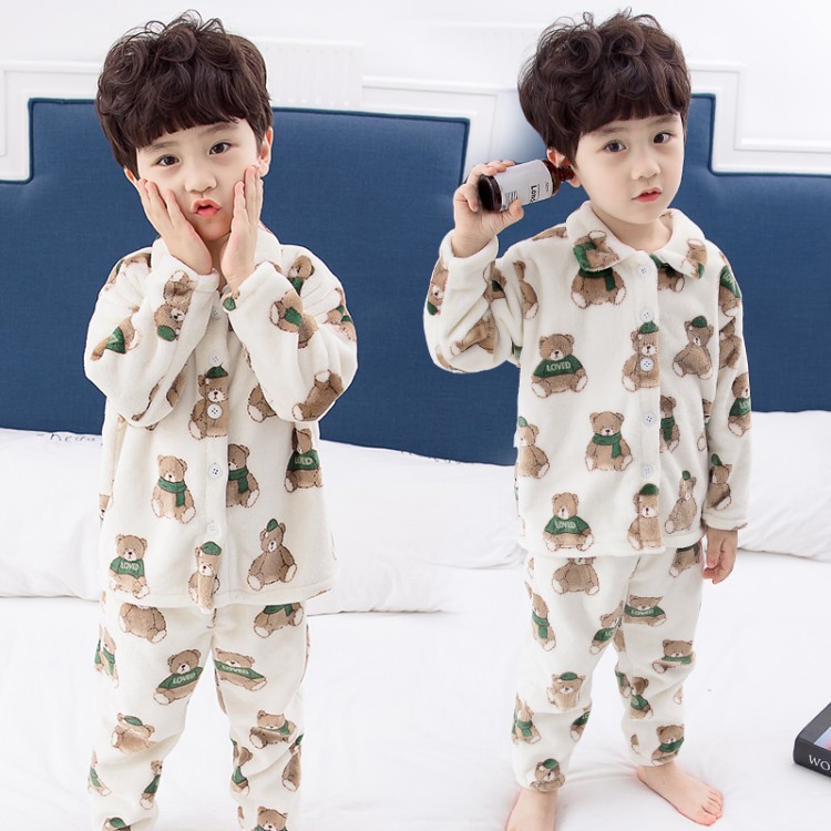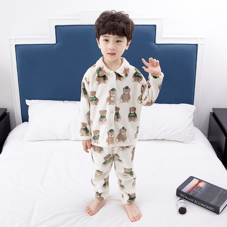 Child Sleepwear Autumn Winter Flannel Boy Girl's Home Conserved Boy Long Sleeve Thickened Boy Coral Suede Suit