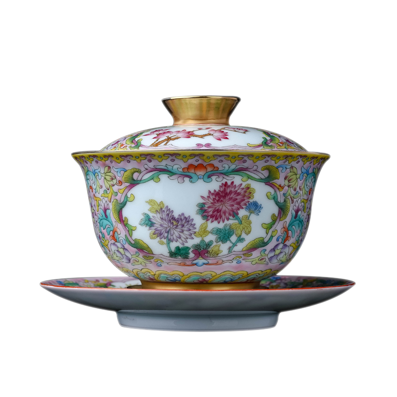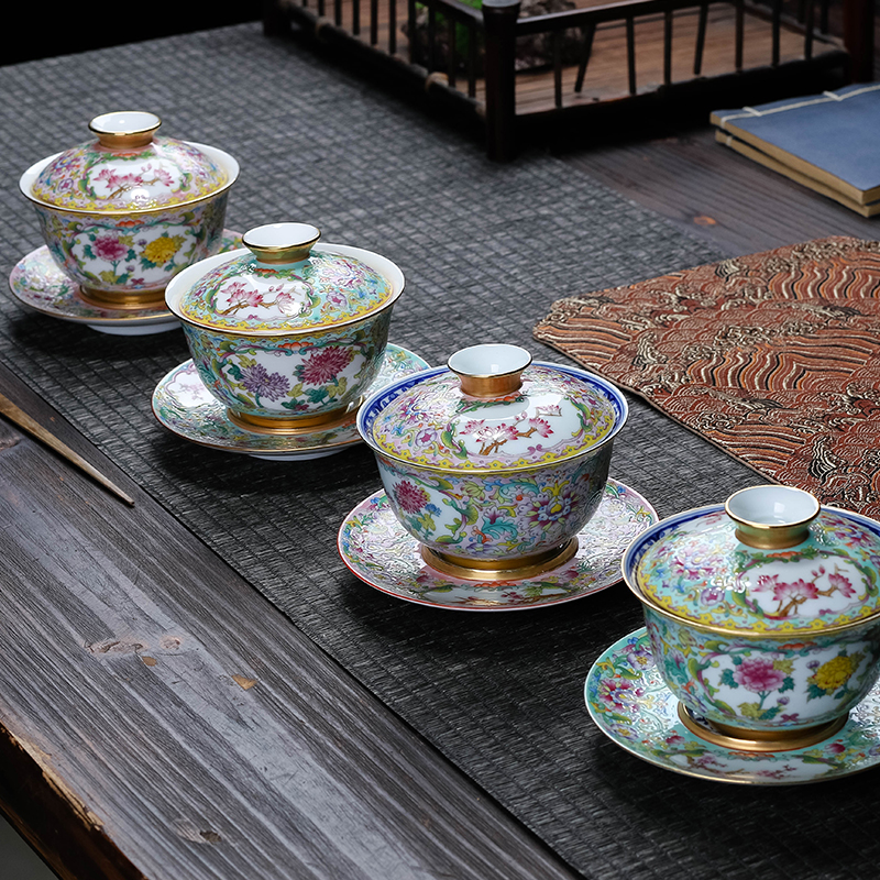 Jingdezhen ceramic tea blue and white porcelain pastel enamel color entangling zhilotus flower flower and bird three Cai bowl tea bowl tea bowl