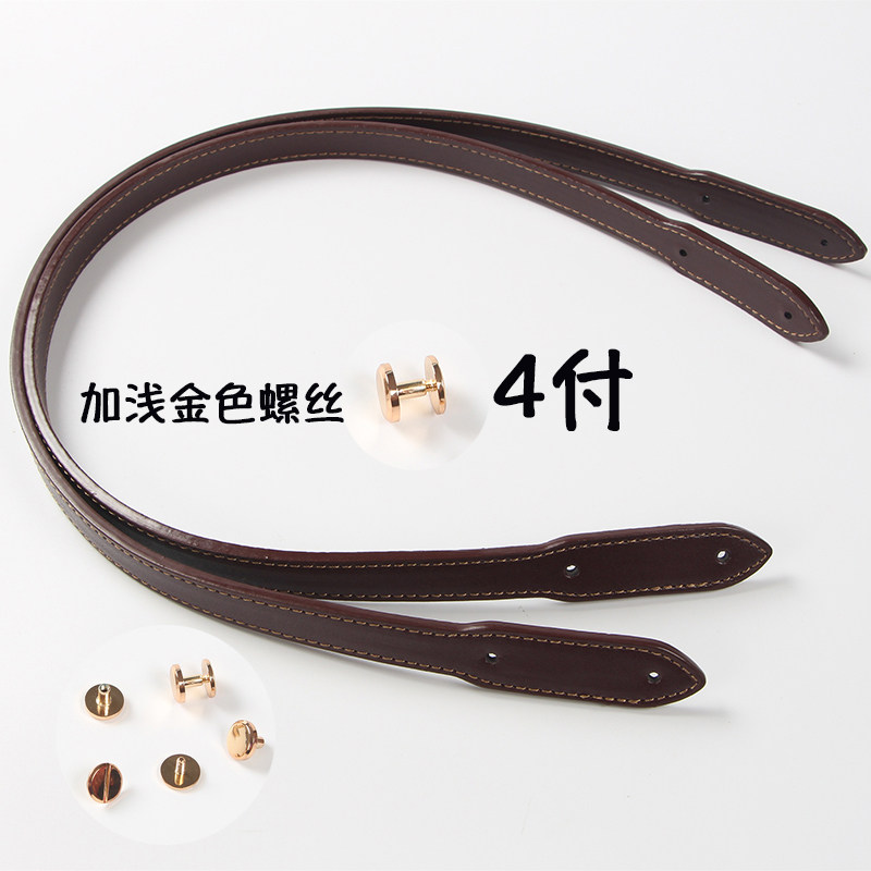 A pair of camel yellow straps for a pair of ancient sweep rivets, a pair of dark brown straps, a pair of ancient sweep rivets, a pair of black straps, a pair of ancient sweep rivets, a pair of camel yellow straps, a pair of 8 light gold screws, a dark coffee bag