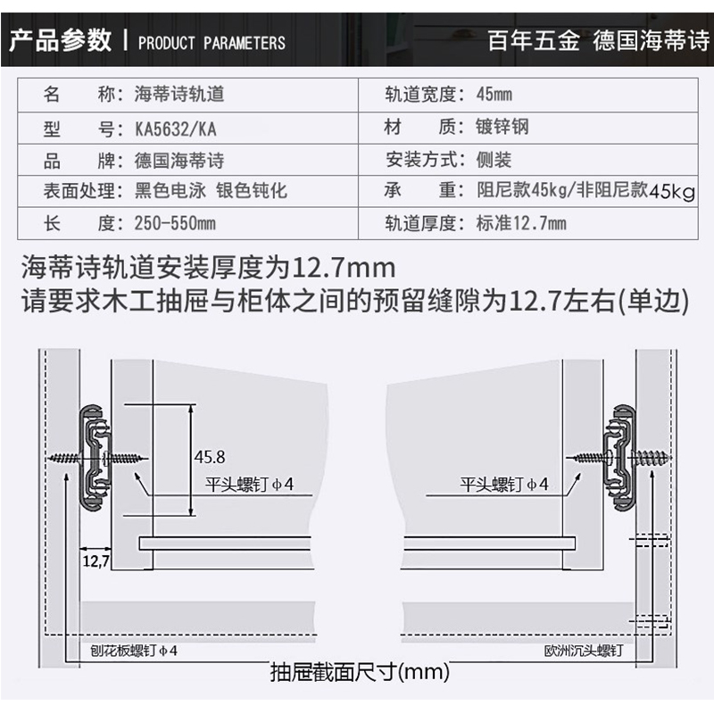 4 (side mounted three-section damping guide) 18 inch 450mm German Hettich