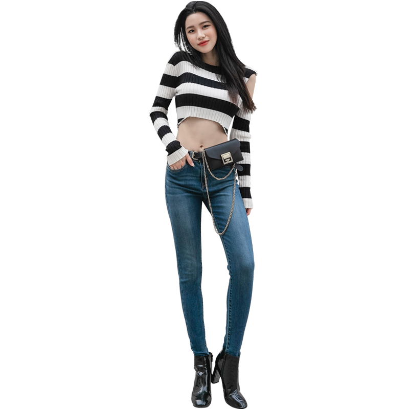 South Korea lets diet jeans women's spring and autumn burr small pants medium high waist straight leg all-in-one thin pants