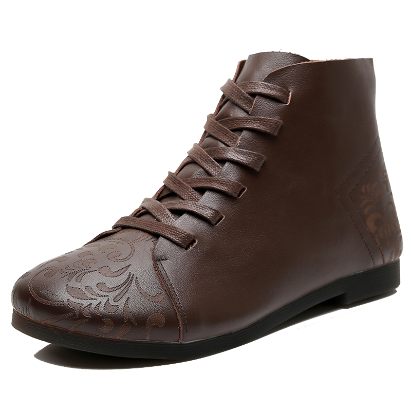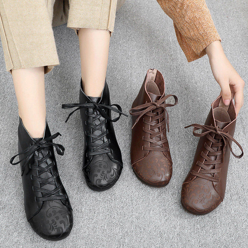 National Wind Moms Shoes Spring Autumn Comfort Soft Bottom Genuine Leather Flat Heel Retro Lady Leather Shoes Short Boots Single Boot Plus Suede Cotton Shoes
