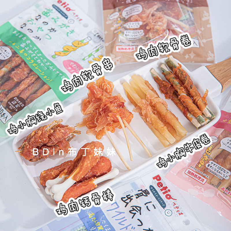(Chicken calcium bone sticks) 7 pieces (small chicken breast wrapped around small fish) 45g (chicken small breast leather roll) 10 pieces (chicken small breast soft stick roll) 10 pieces (chicken cartilage string) 5 pieces are subject to the food taste in grams
