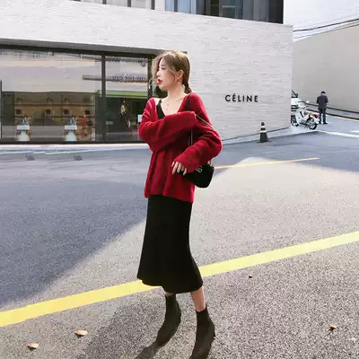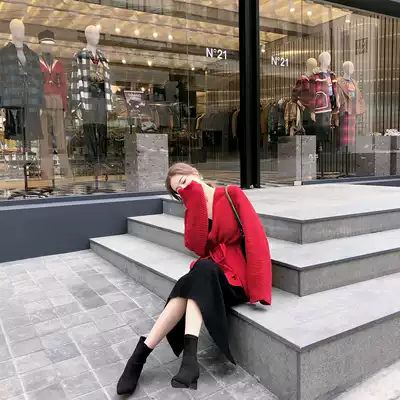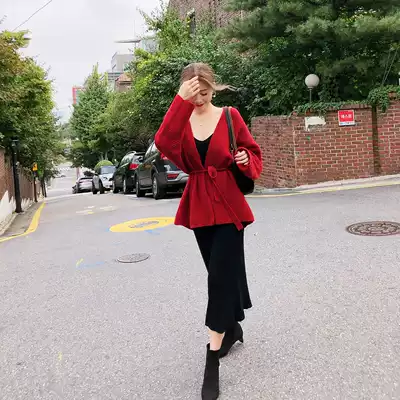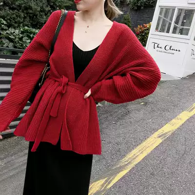 ByYou 2019 autumn red lazy wind sweater women's wild new waist strap knit cardigan coat tide