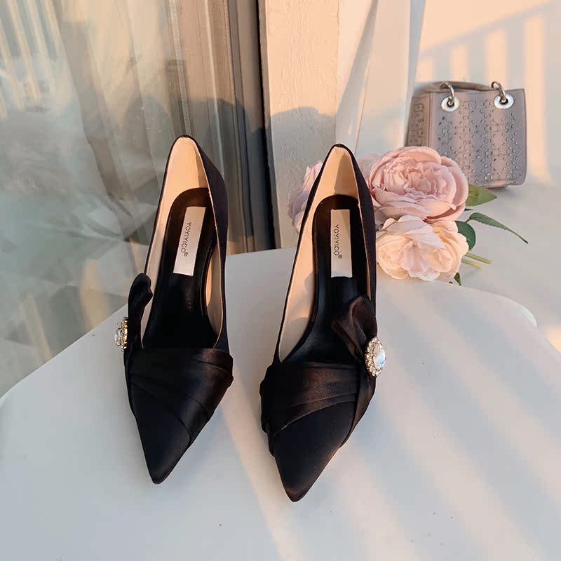 Yang Yiyi new French high heels girl pointed thin heel elegant rhinestone bow net red Joker shoes