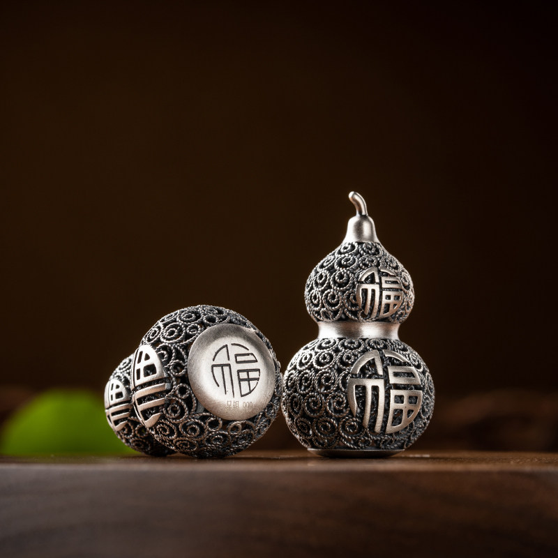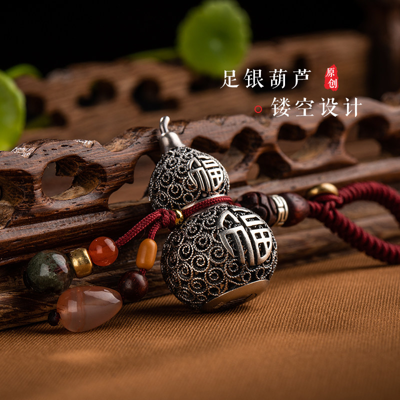 Park room S999 foot silver hollow gourd mobile phone lanyard men's retro car key chain bag hanging women's silver creative gifts