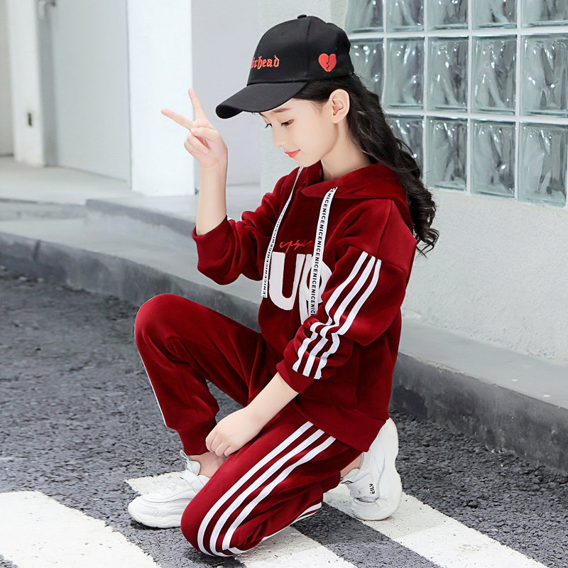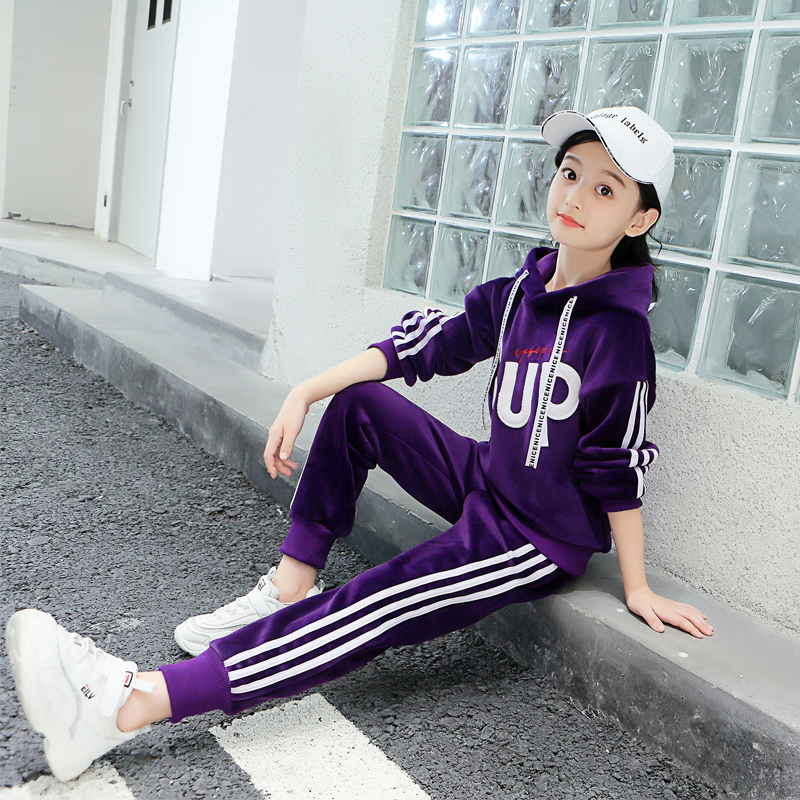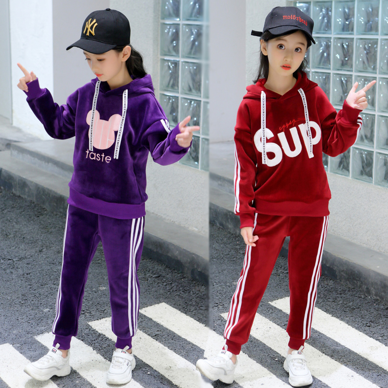 Girl Gold Velvet Suit Autumn winter new CUHK Double Face Suede Plus Suede Thickened Children's Pants Thick Cotton T Two sets