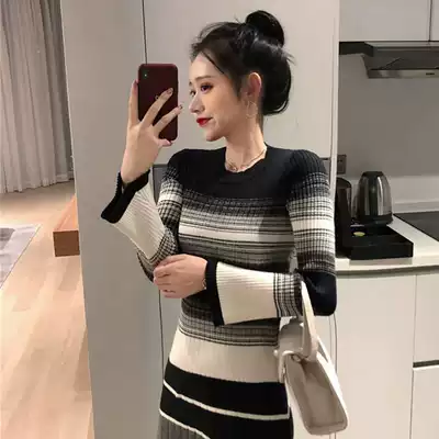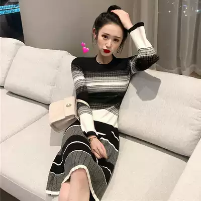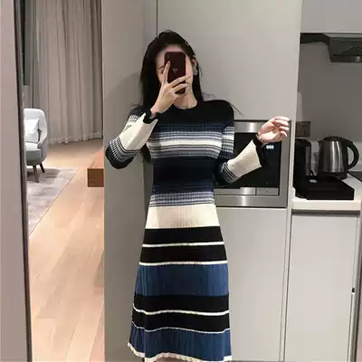 European station 2021 Autumn New French vintage sweet striped knee long skirt slim slim knit dress