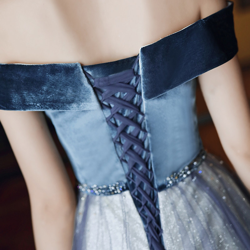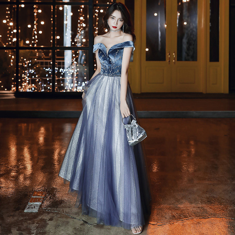 Blue Evening Dress Lady 2020 New Banquet Temperament Noble Lined Shoulders Long Version Fairy Gas Dreamy Annual Meeting Foreign Dress