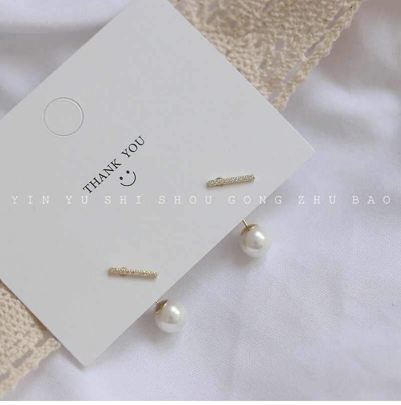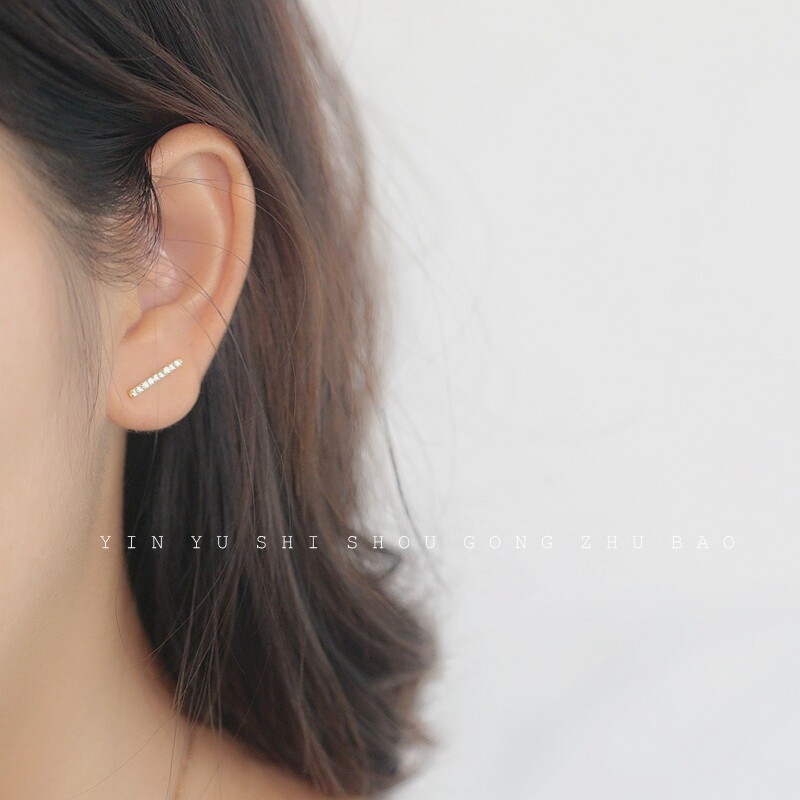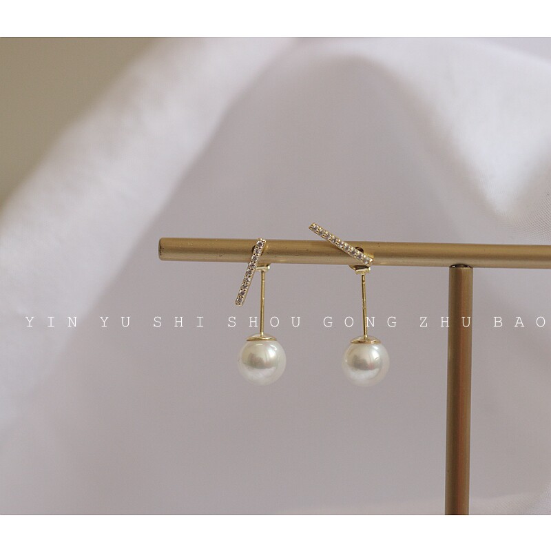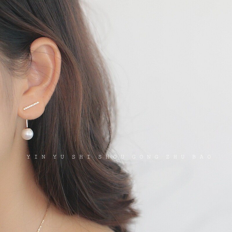 Korean temperament a pair of earrings 925 silver plated 14k gold with diamonds one word short stick ear pin Shijia pearl earrings