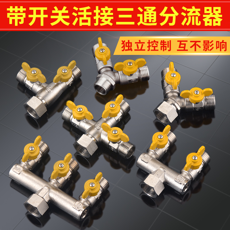 Copper ball valve three-way water distributor valve one-in-two out of three-out multifunctional band switch tap to live with the current divider