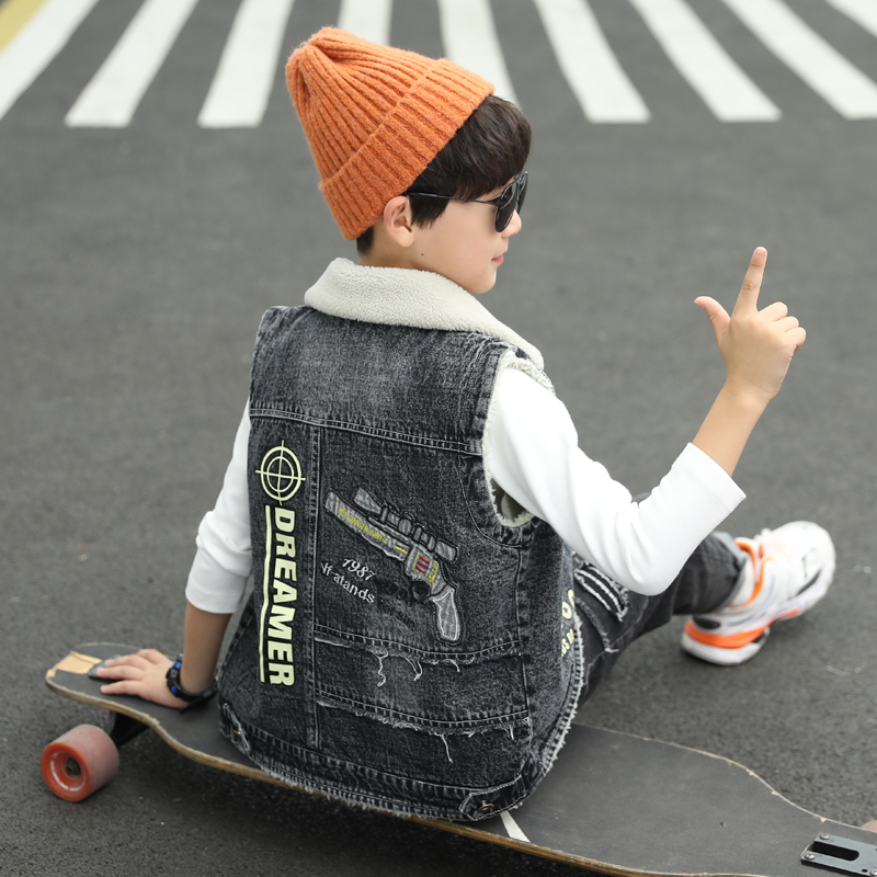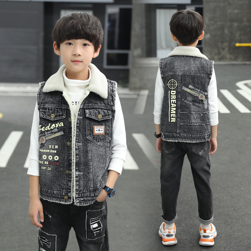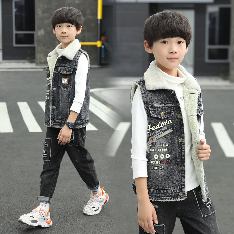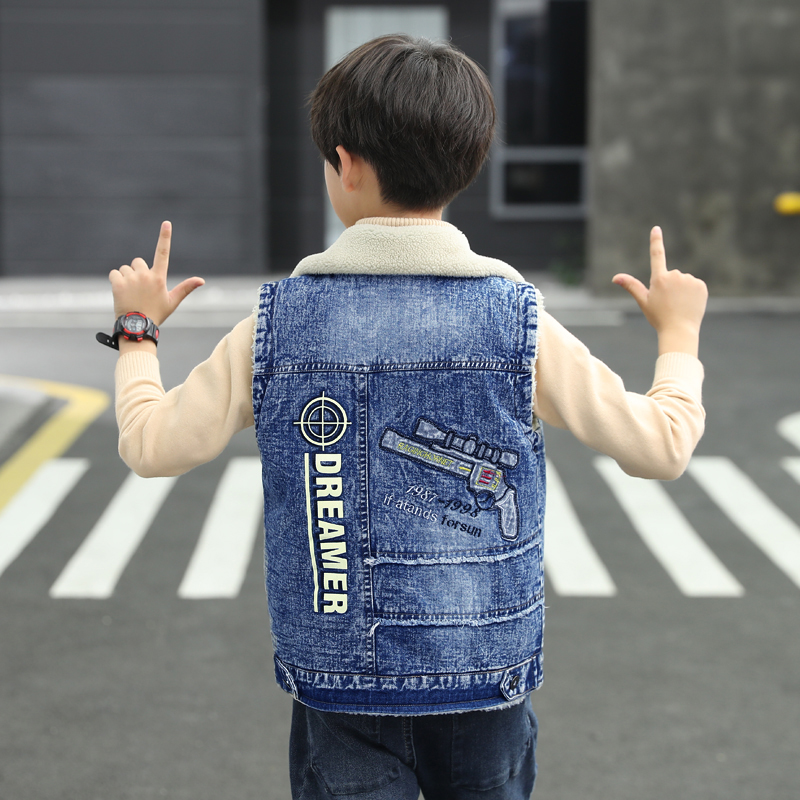 Children's plus velvet thick lamb wool vest boys autumn and winter denim vest in the big boy Korean version of the Western style vest tide