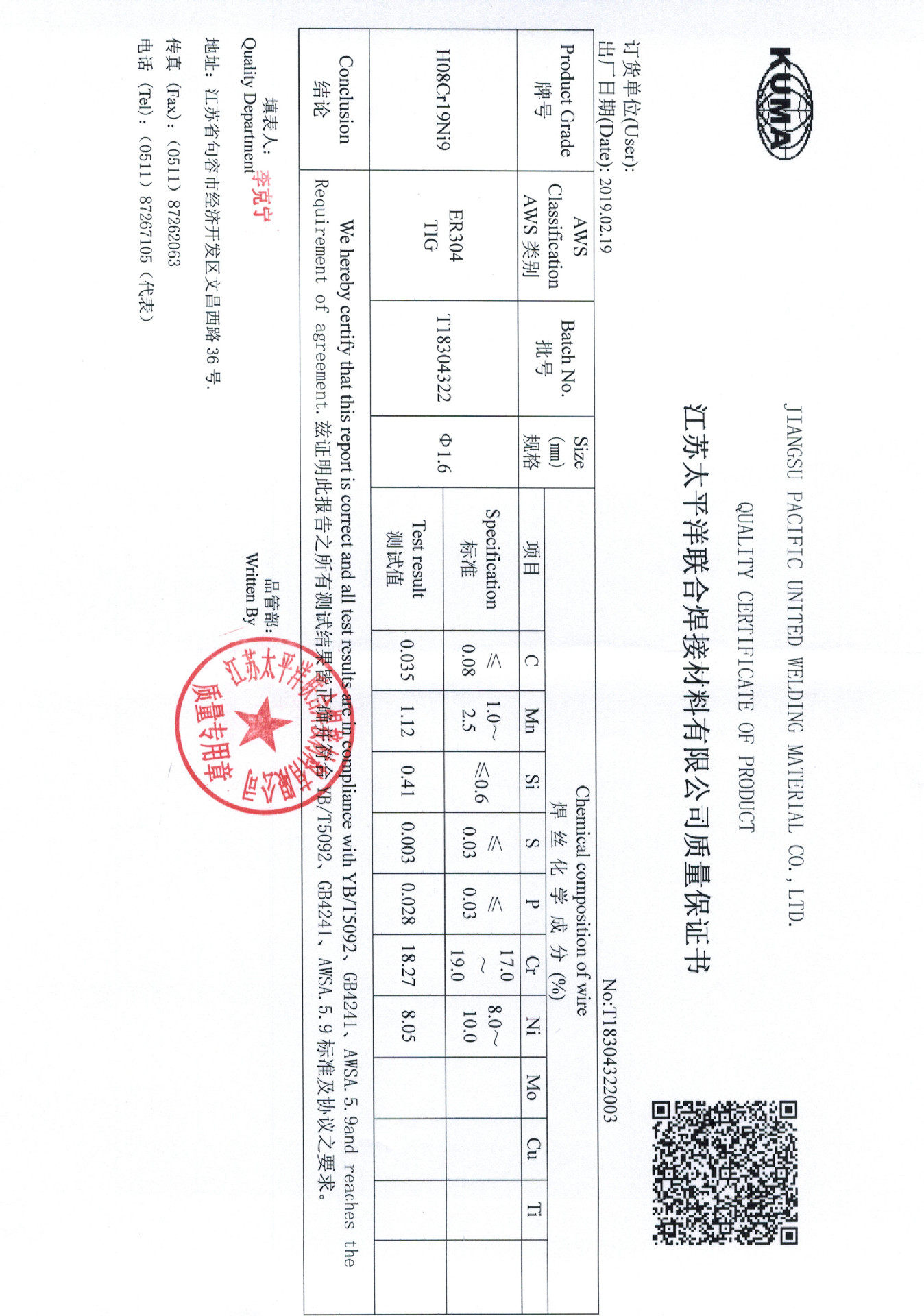 Pacific 304 argon welding wire Zhejiang Yatai welding material Co., Ltd. has physical store sales right
