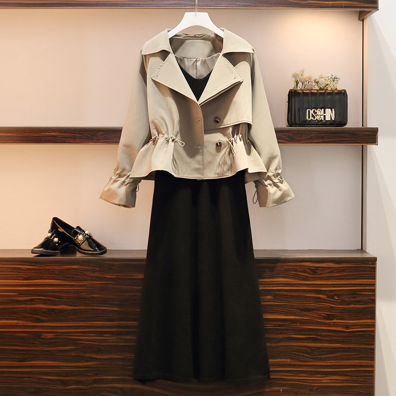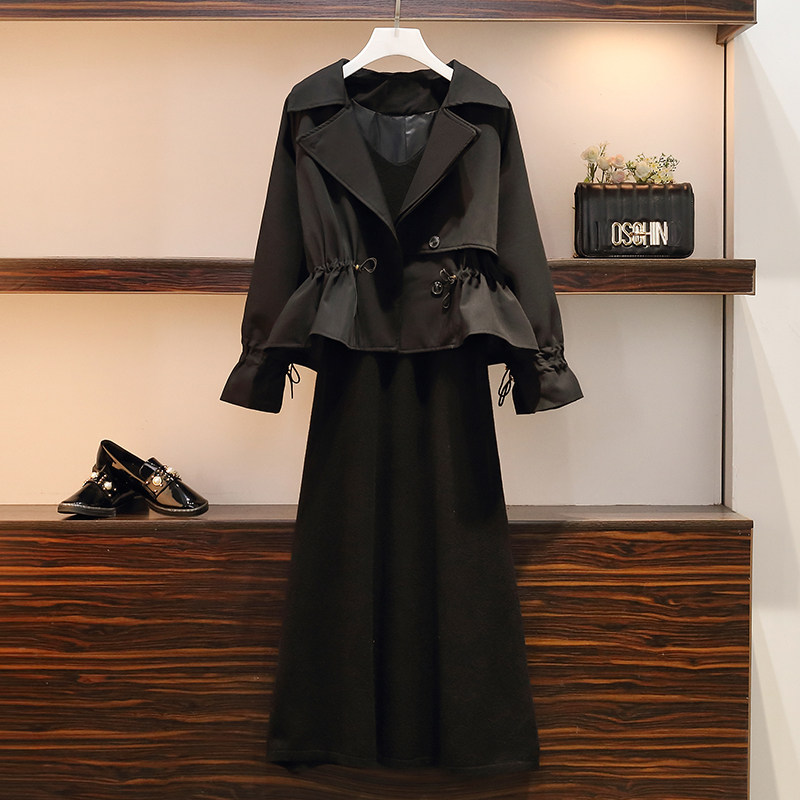 Large size women's clothing 2021 autumn new thin fashion dress Fat sister Foreign school age reduction belly cover two-piece suit