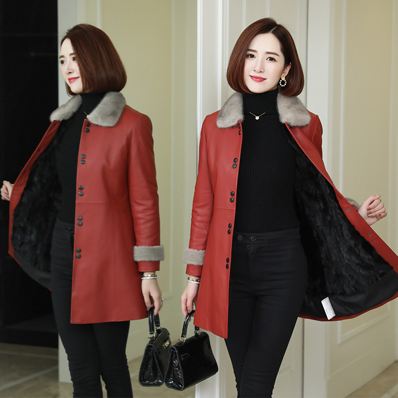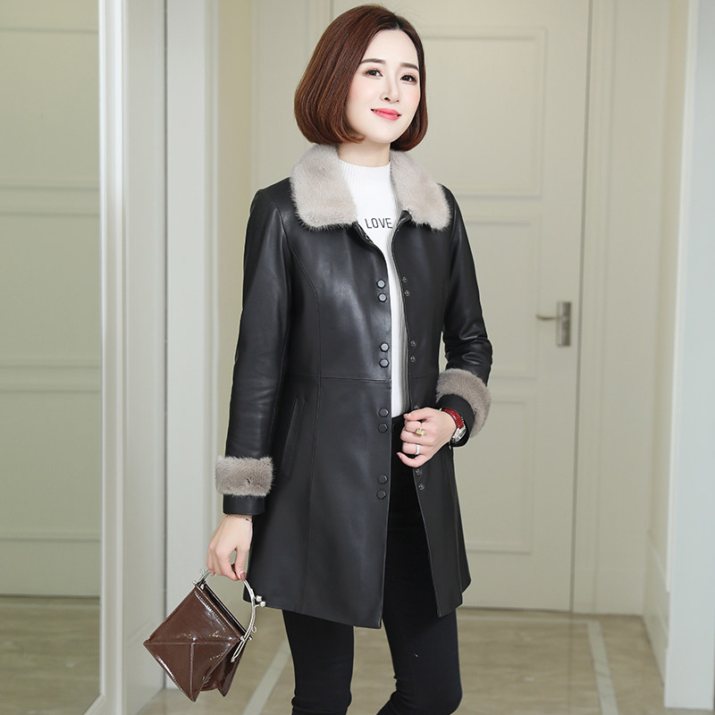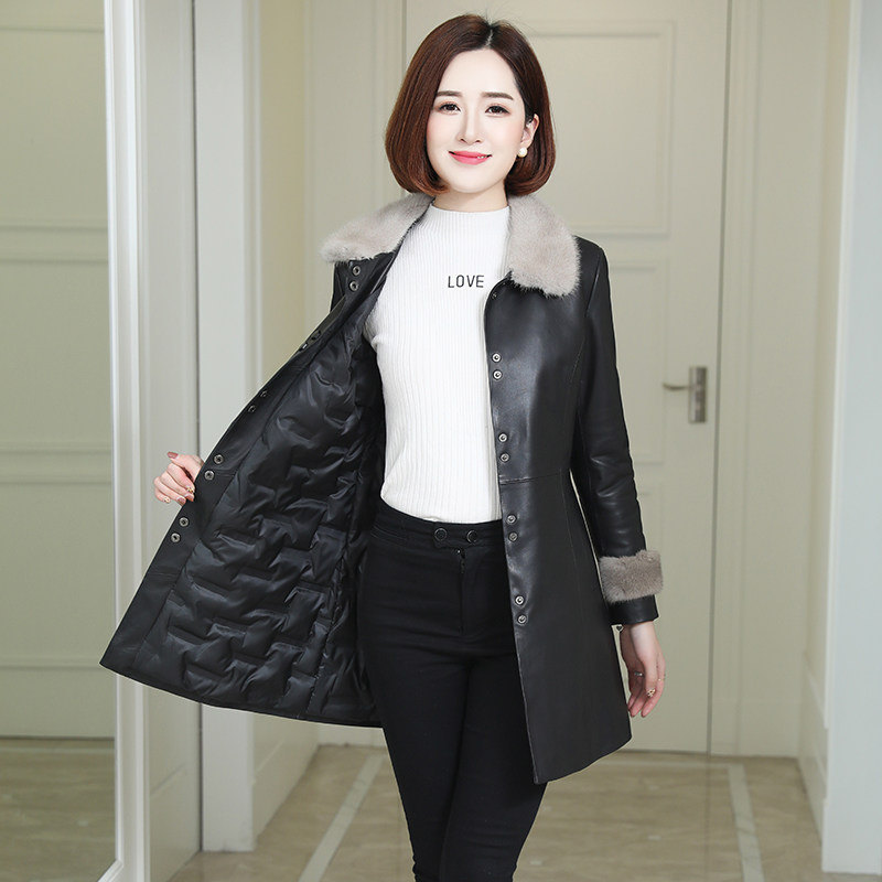 Real leather down jacket woman with medium long version of fur collar water mink liner Haining sheep leather coat leather coat leather clothing integrated leather grass jacket