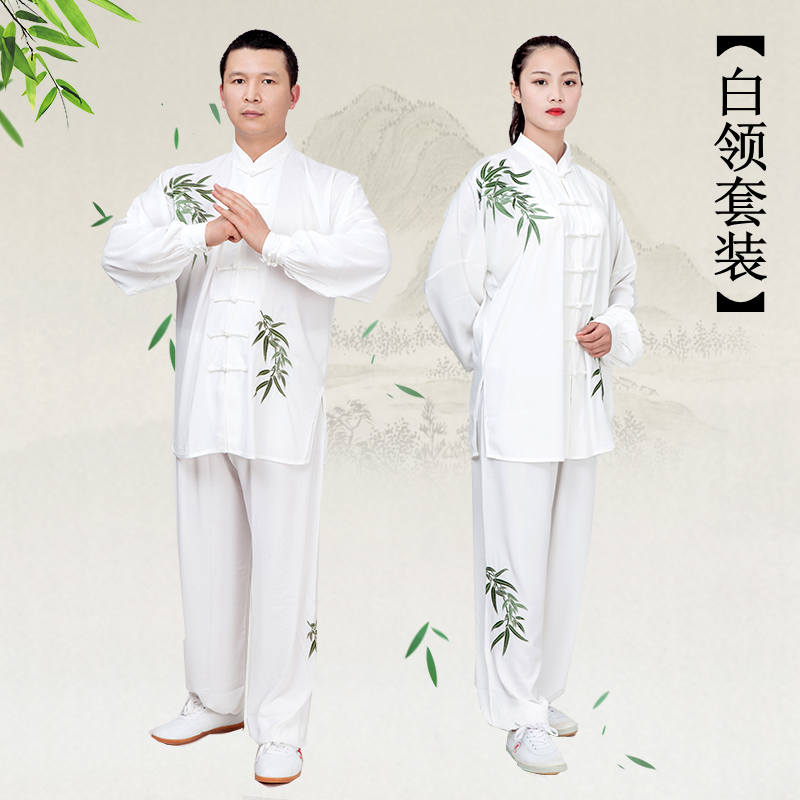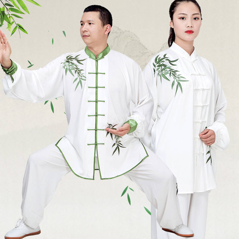 Tai Chi Fu Women's Spring Summer Bamboo Leaves Green Flower Porcelain Embroidered Martial Arts Performance Martial Arts Performance Competition Taijiquan Costume Men