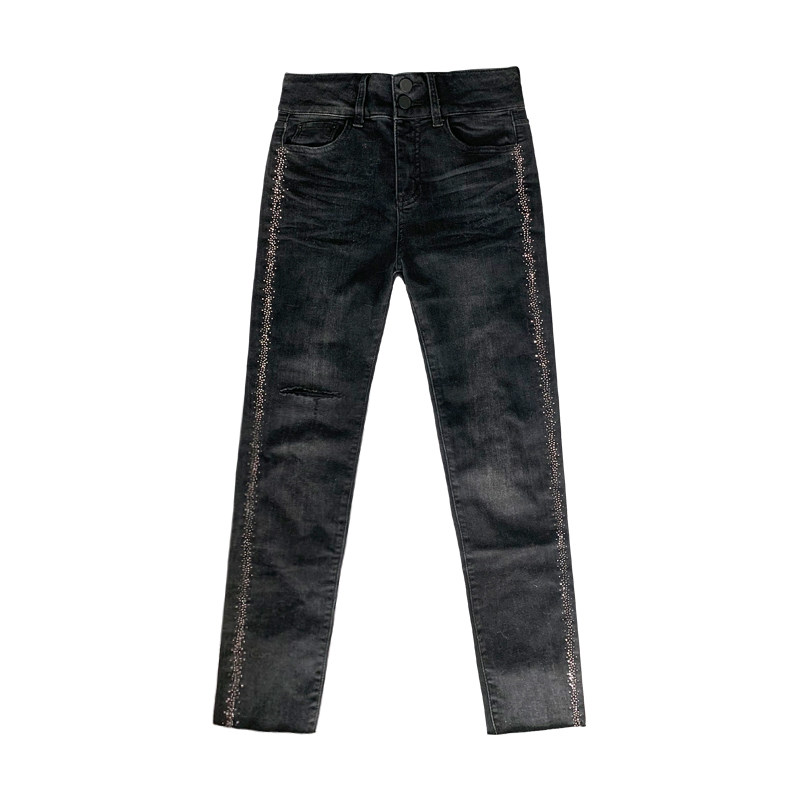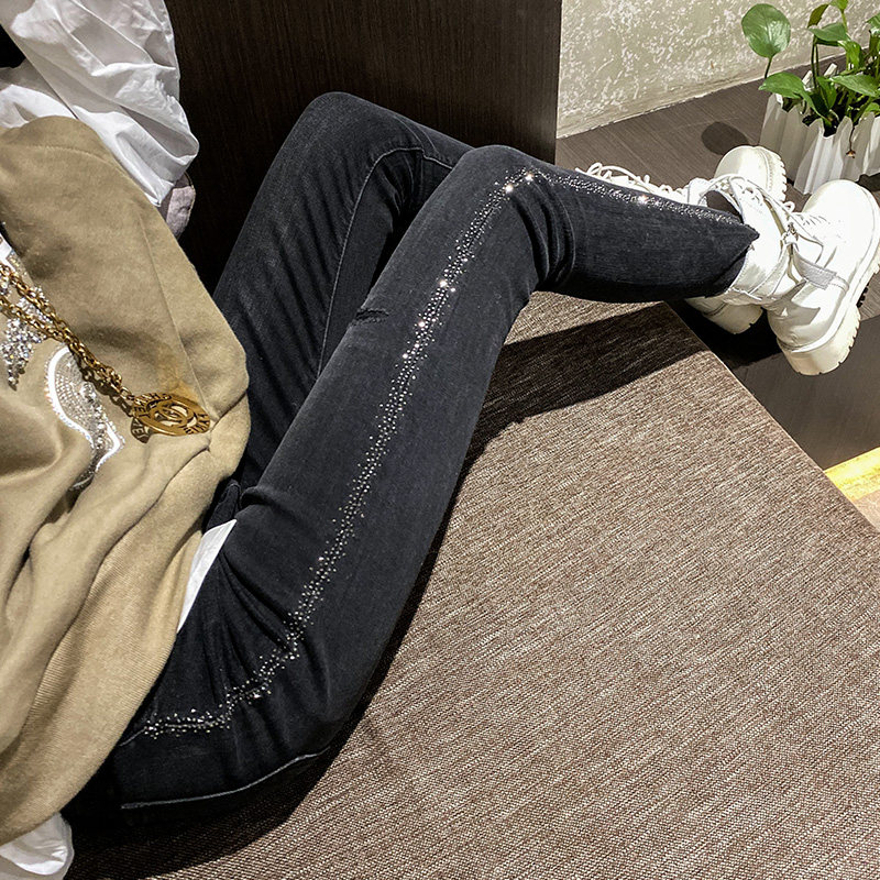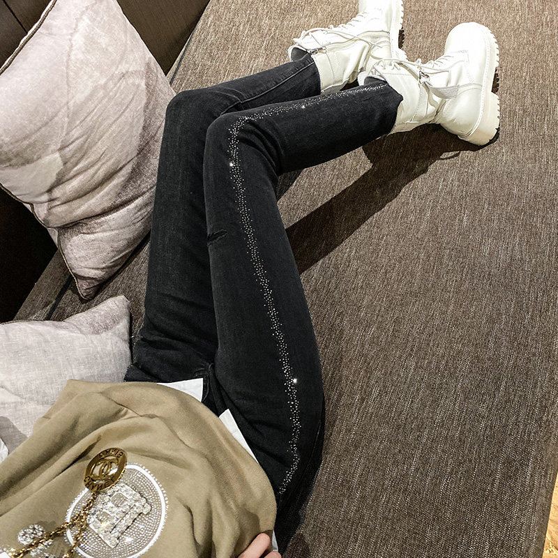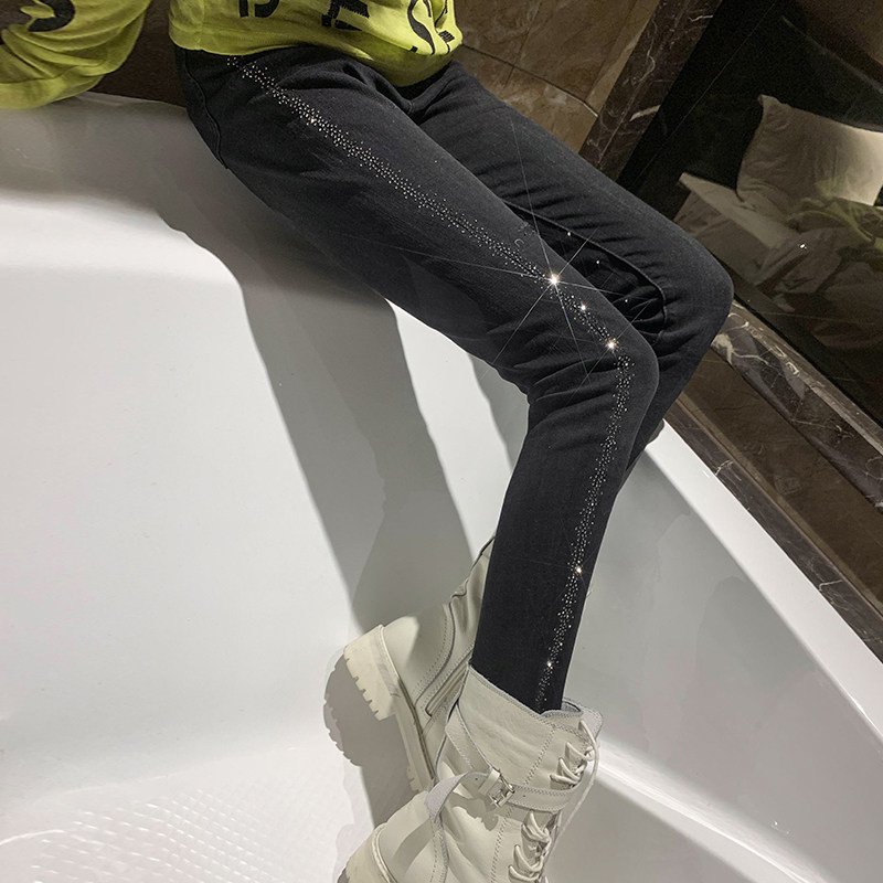 Black jeans women's 2020 autumn new European station heavy industry hot drill high waist thin plus velvet slim cigarette tube pants